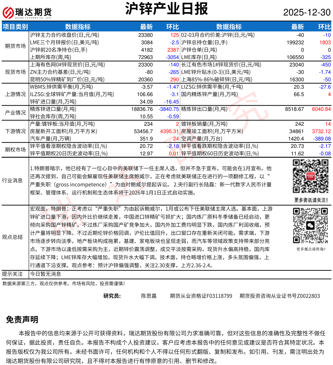 2025-12-31瑞达期货沪锌产业日报20251230