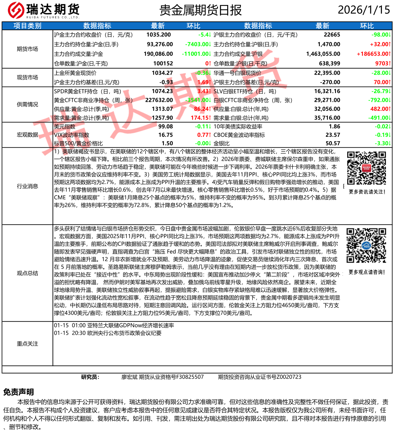 2026-01-15瑞达期货贵金属市场每日全景分析报告20260115