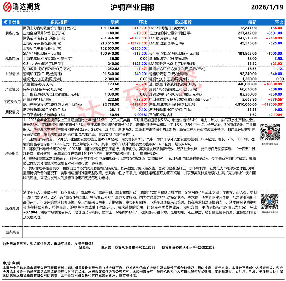 2026-01-19瑞达期货沪锡产业日报20260119