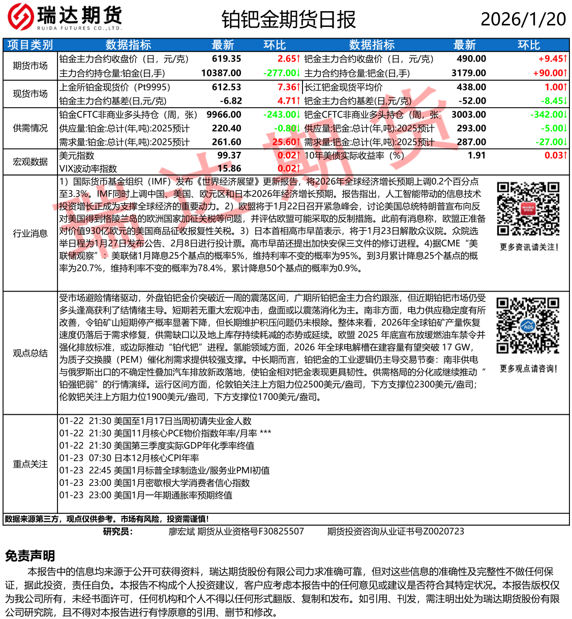 2026-01-26瑞达期货铂钯金市场每日全景分析报告20260126