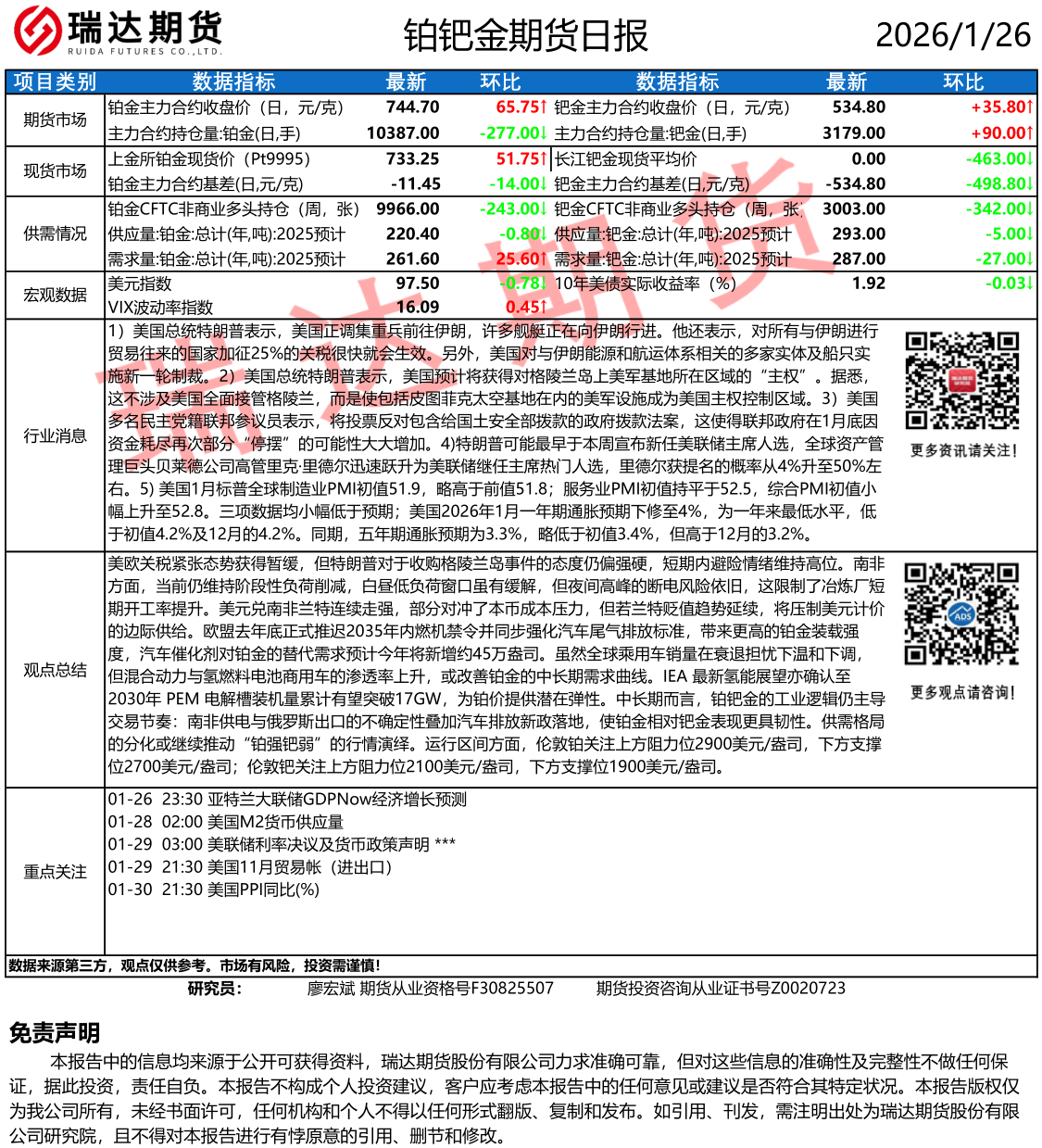 2026-01-26瑞达期货铂钯金市场每日全景分析报告20260126