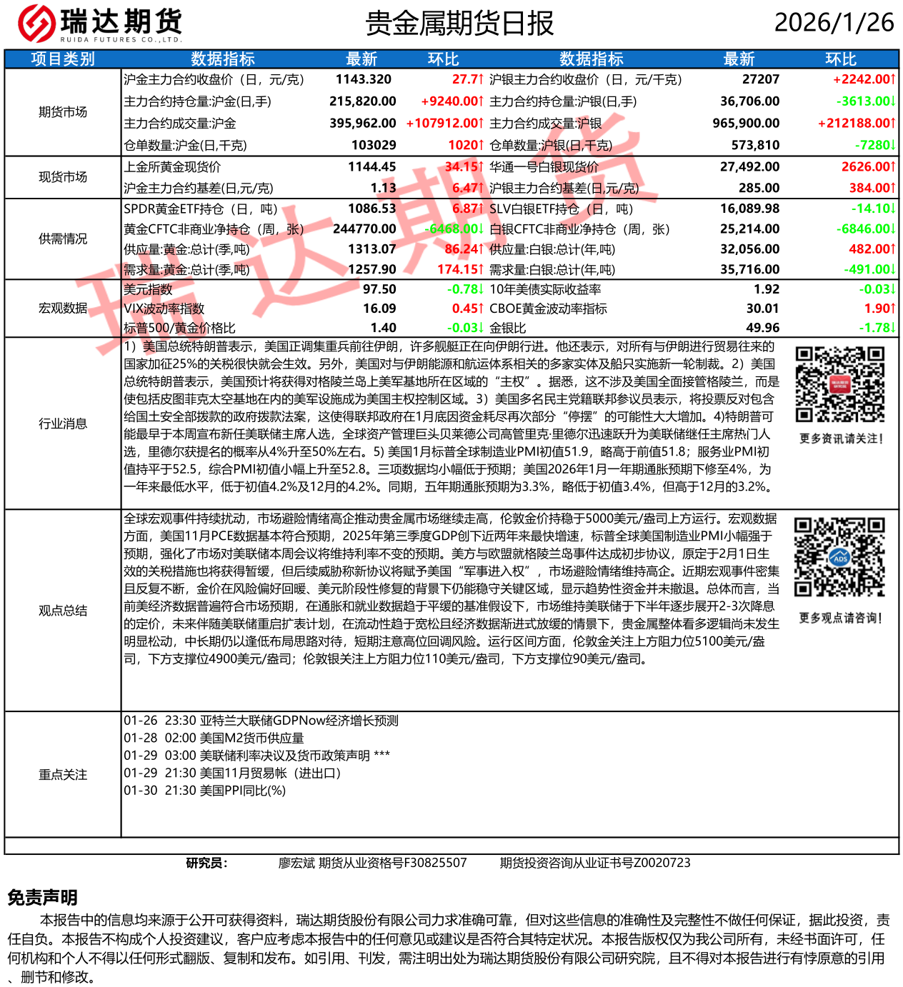 2026-01-26瑞达期货贵金属市场每日全景分析报告20260126