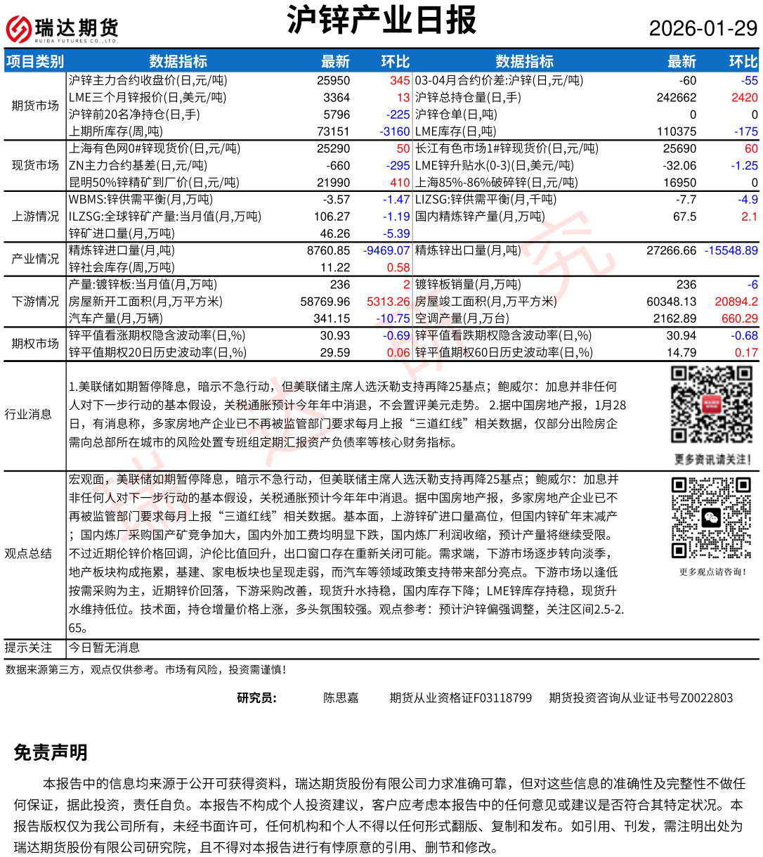 2026-01-30瑞达期货沪锌产业日报20260129