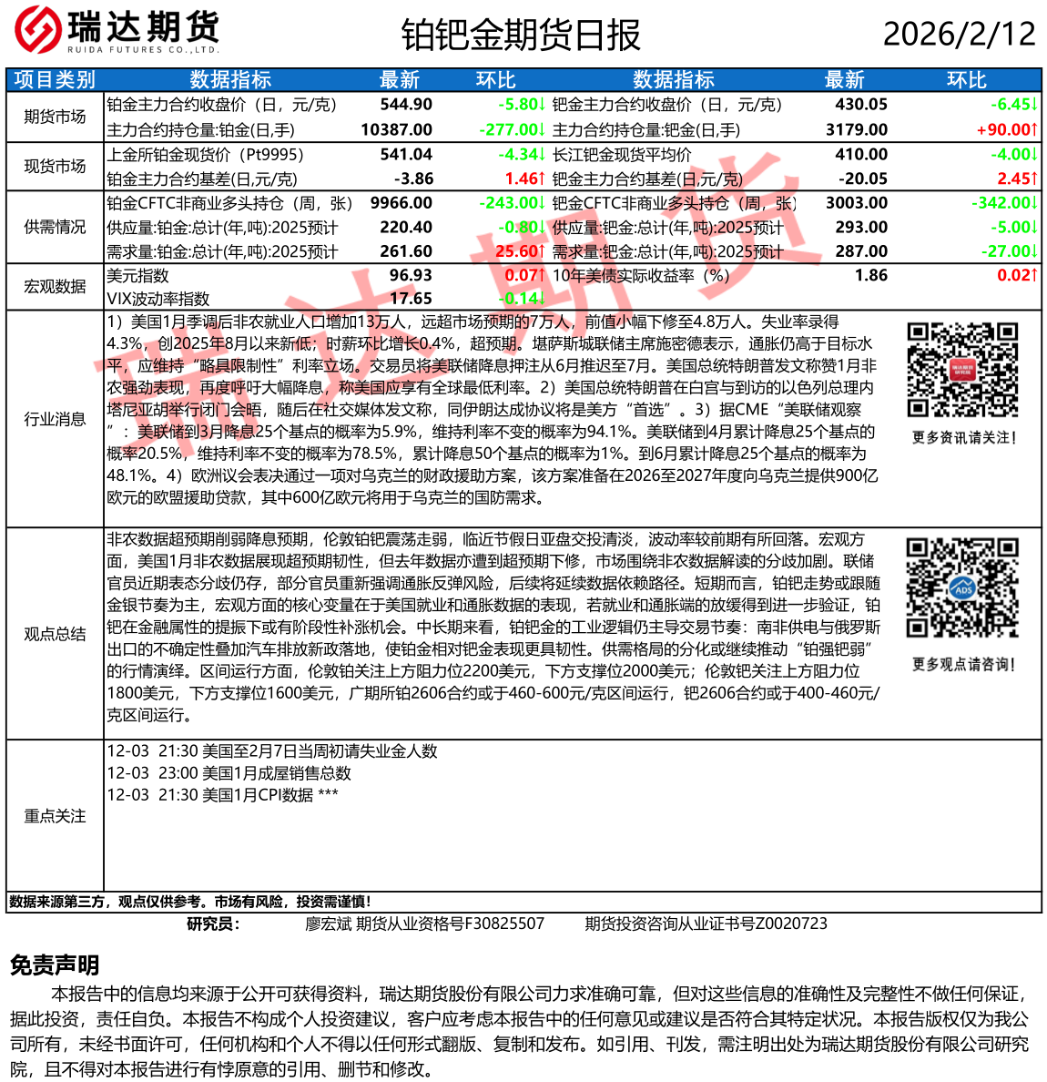 2026-02-12瑞达期货铂钯金市场每日全景分析报告 20260212