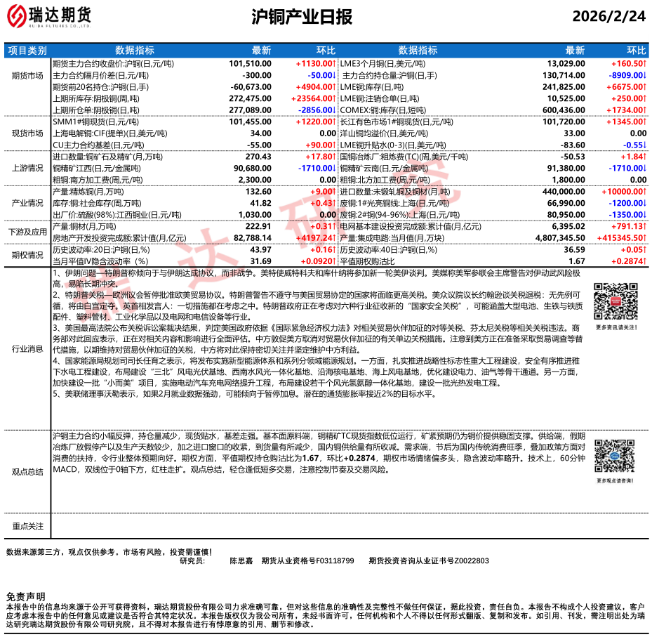 2026-02-25瑞达期货沪锡产业日报20260224