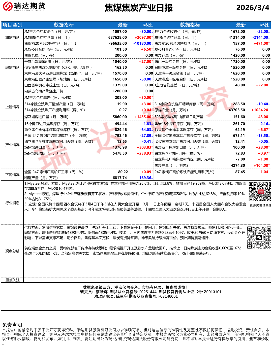 2026-03-04瑞达期货焦煤焦炭产业日报20260304