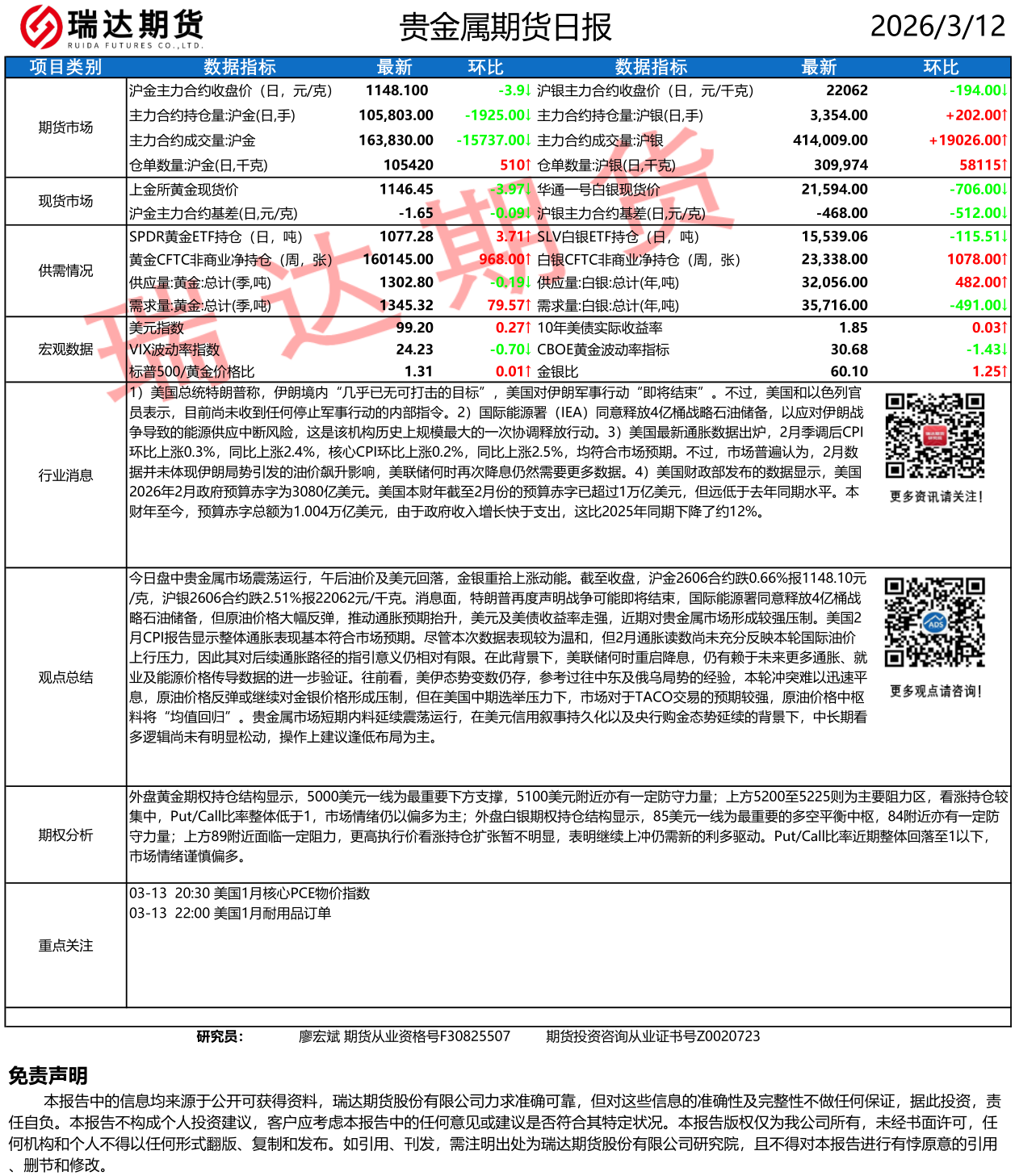 2026-03-12瑞达期货贵金属市场每日全景分析报告 20260312