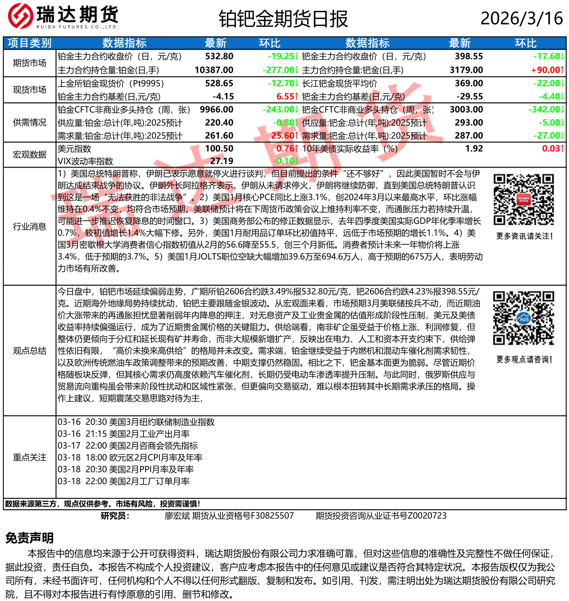 2026-03-19瑞达期货铂钯金市场每日全景分析报告 20260319