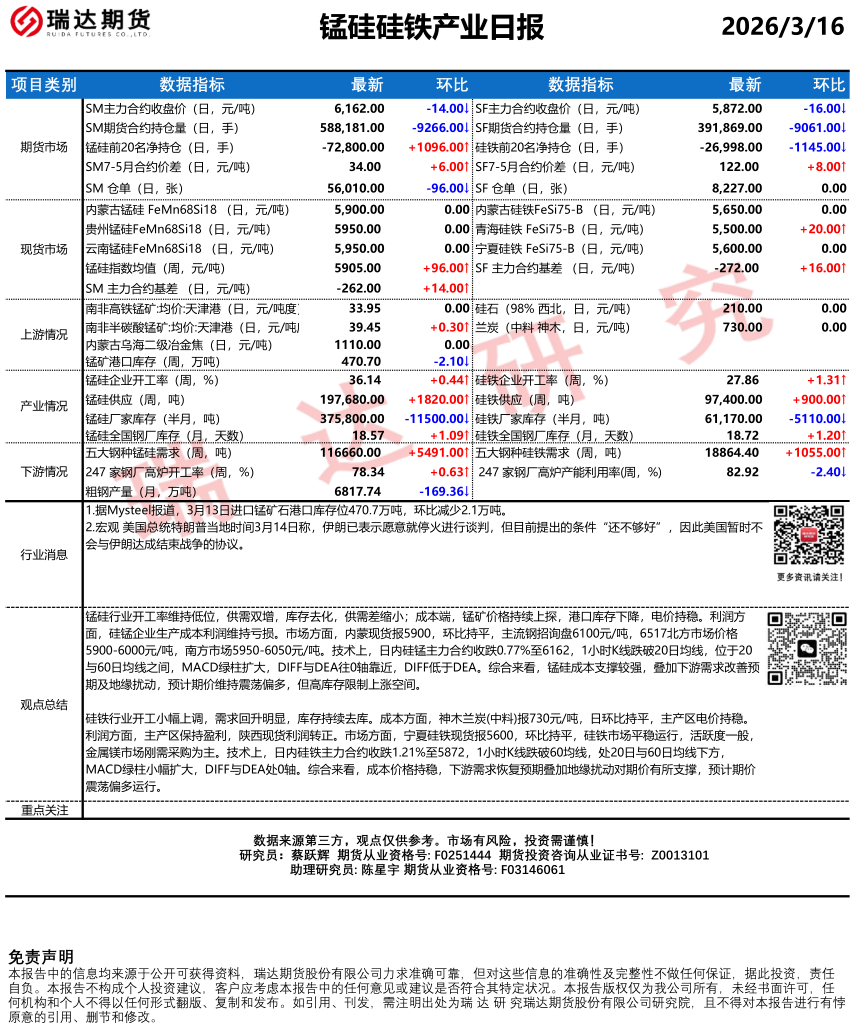 2026-03-17瑞达期货锰硅硅铁产业日报20260316