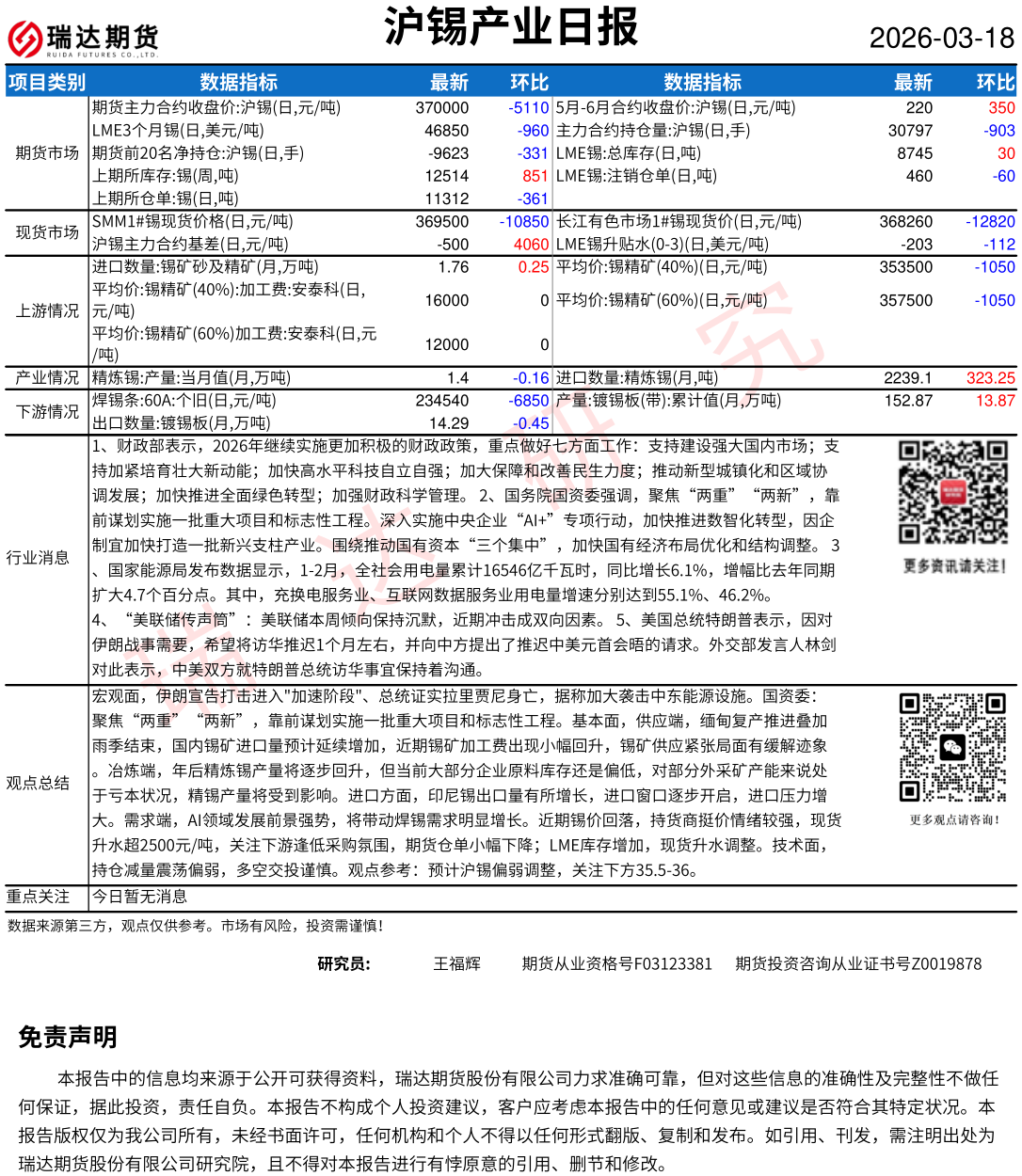 2026-03-18瑞达期货沪锡产业日报20260318