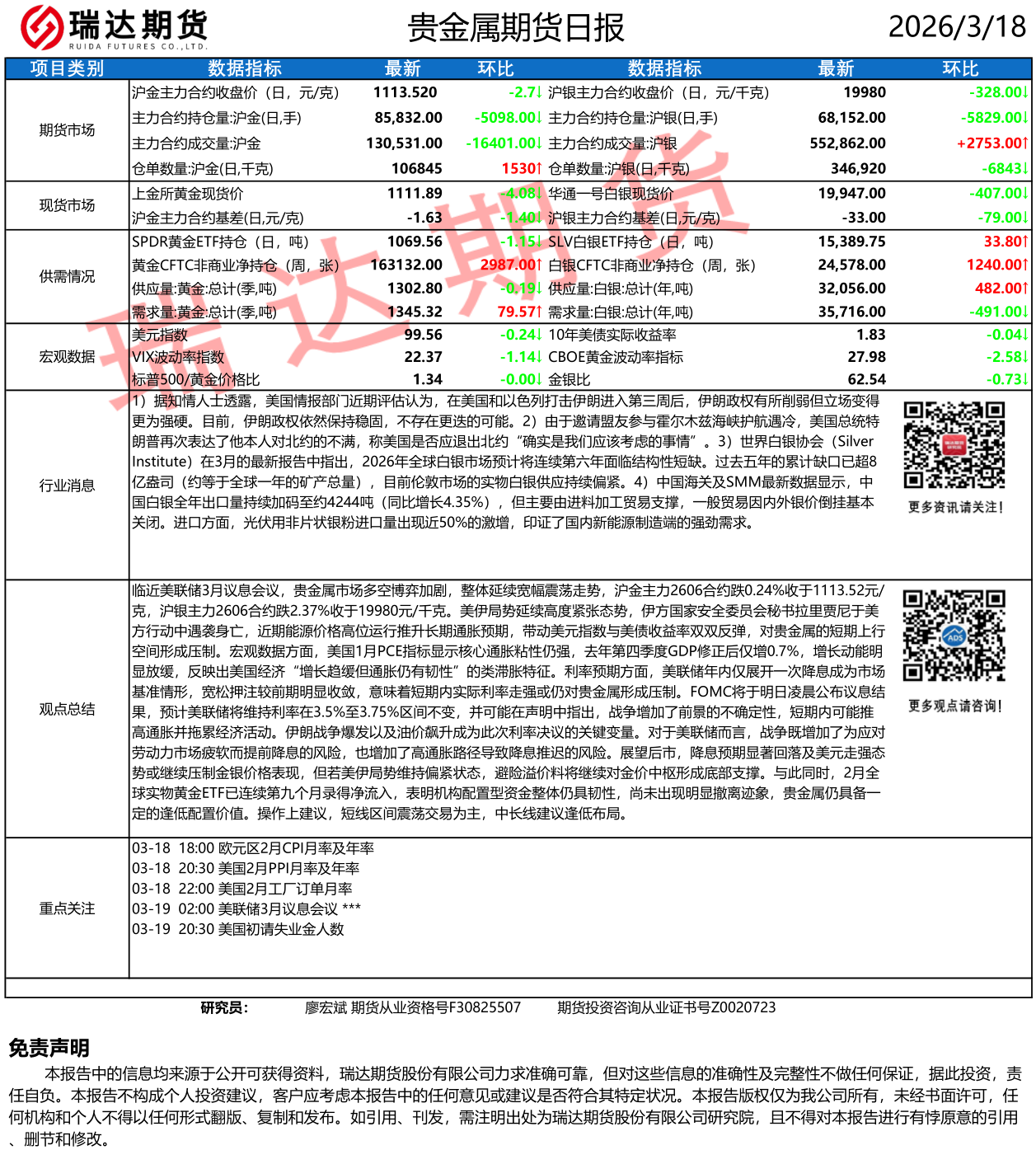 2026-03-19瑞达期货贵金属市场每日全景分析报告 20260318