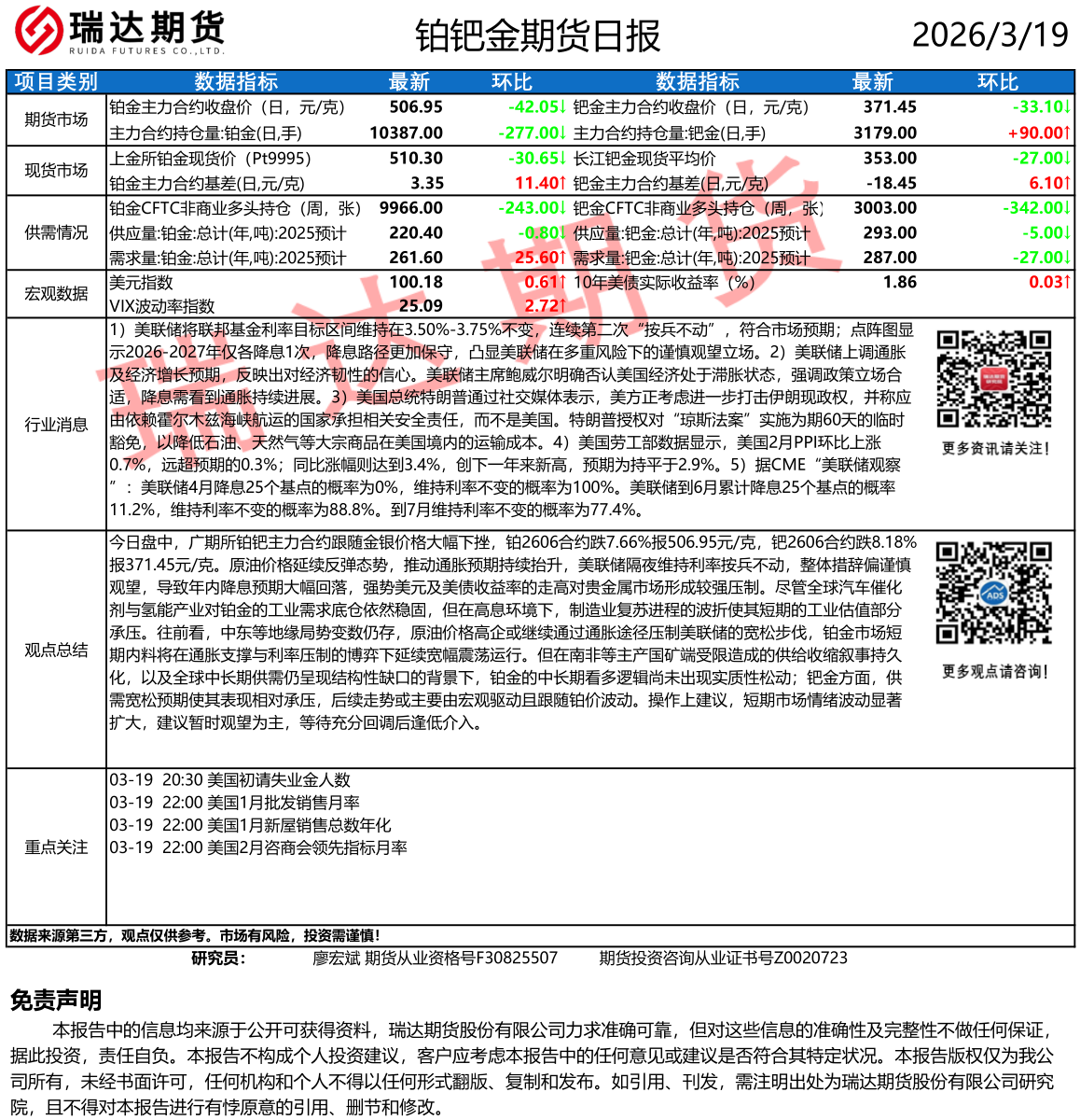 2026-03-19瑞达期货铂钯金市场每日全景分析报告 20260319