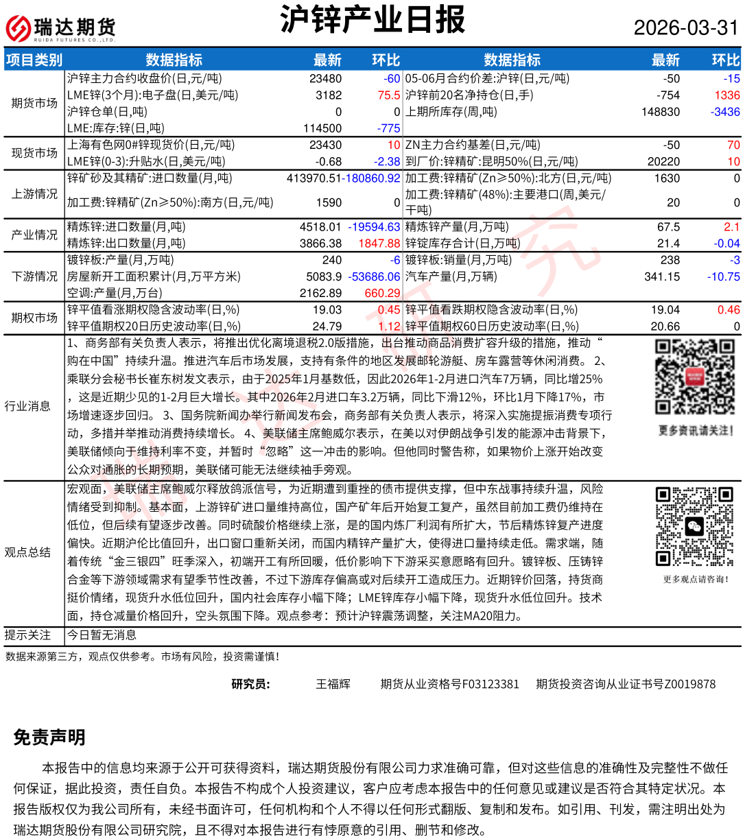 2026-03-31瑞达期货沪锌产业日报20260331