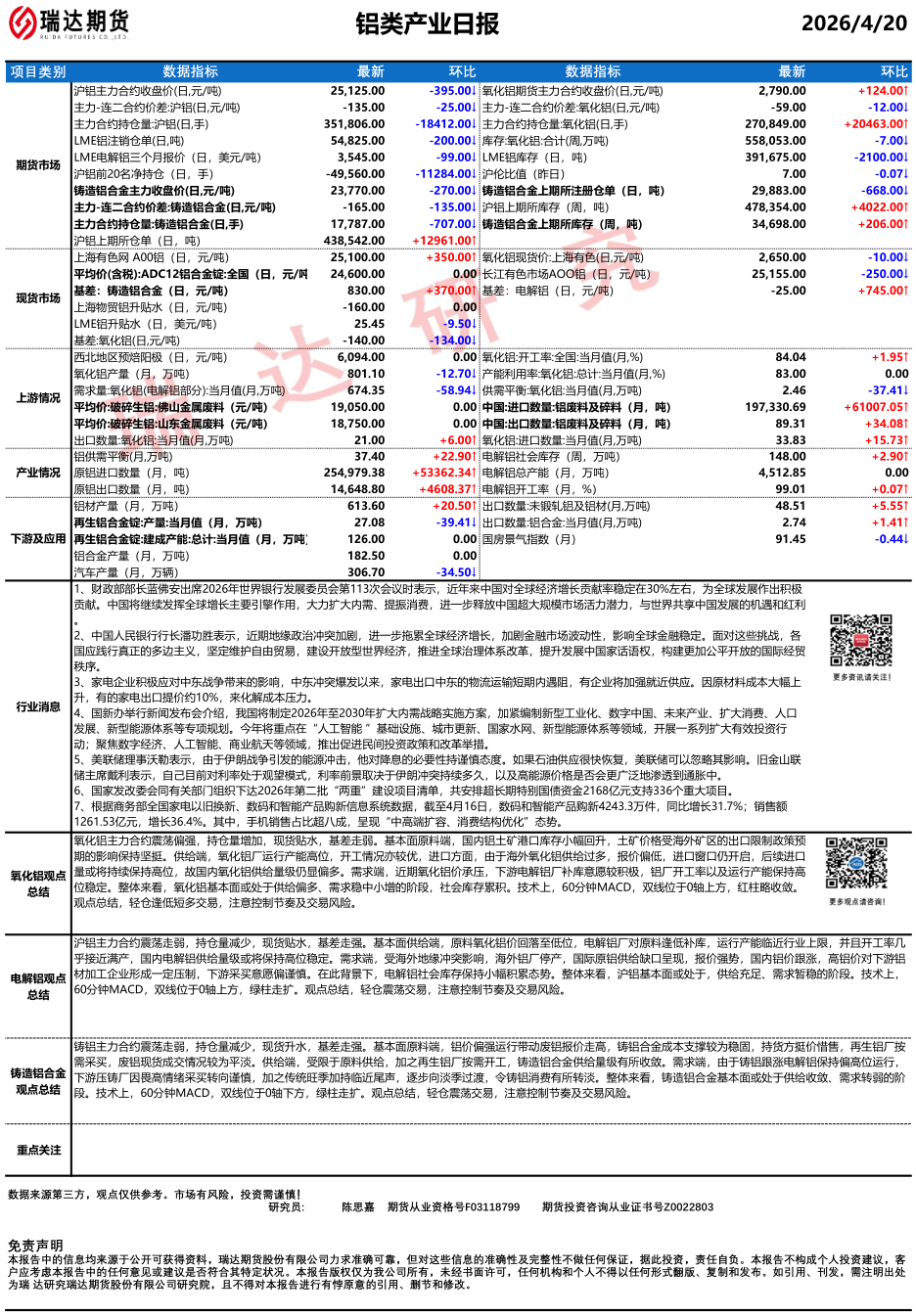 瑞达期货铝类产业日报20260420