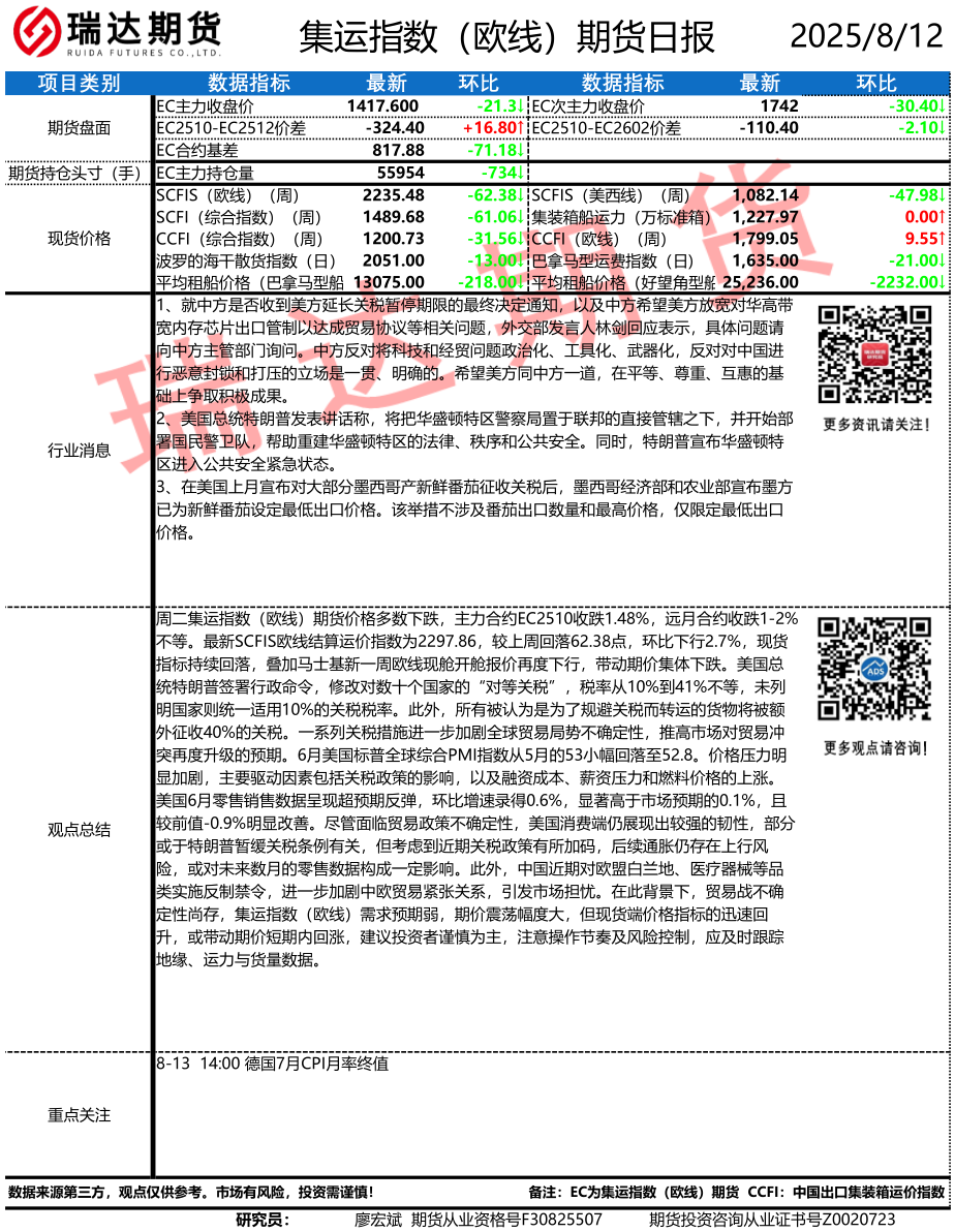 2025-12-04瑞达期货集运指数(欧线)期货市场每日全景分析报告202451204