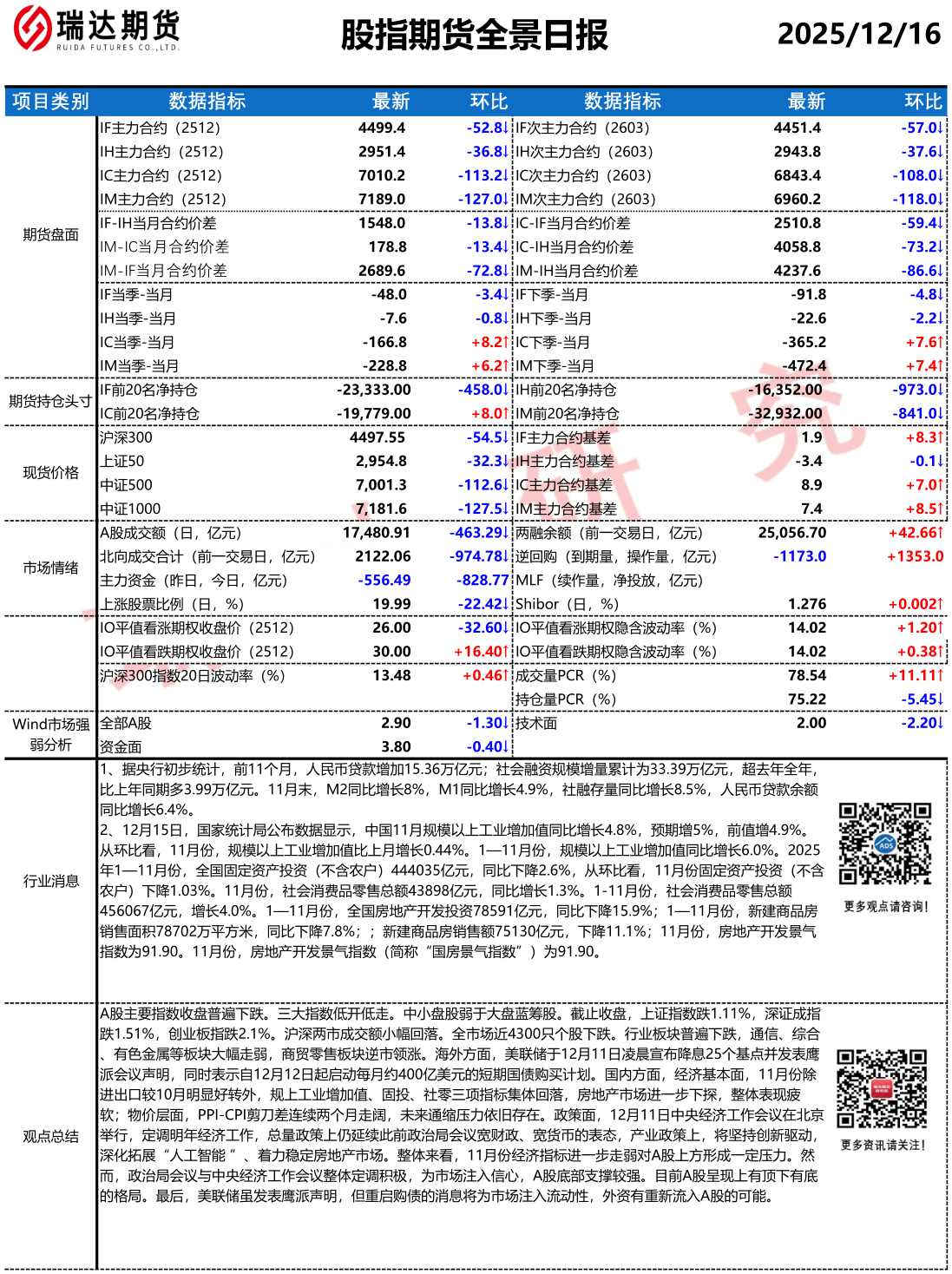 2025-12-17瑞达期货股指期货市场每日全景分析报告20251217