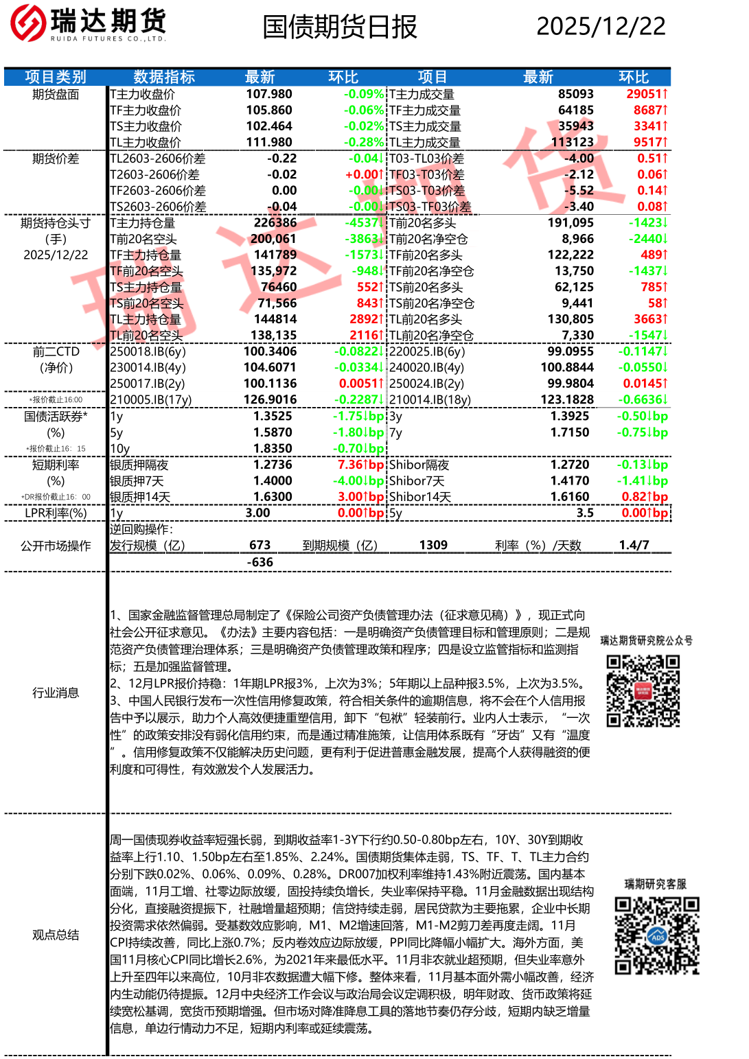 2025-12-22瑞达期货国债期货市场每日全景分析报告20251222