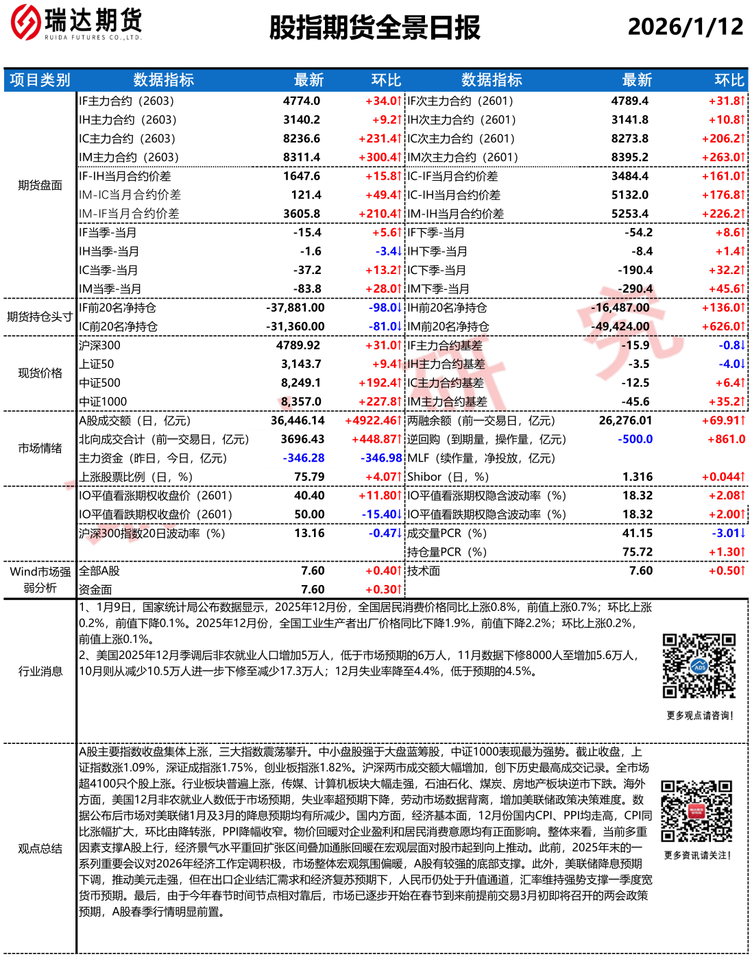 2026-01-13瑞达期货股指期货市场每日全景分析报告20260112