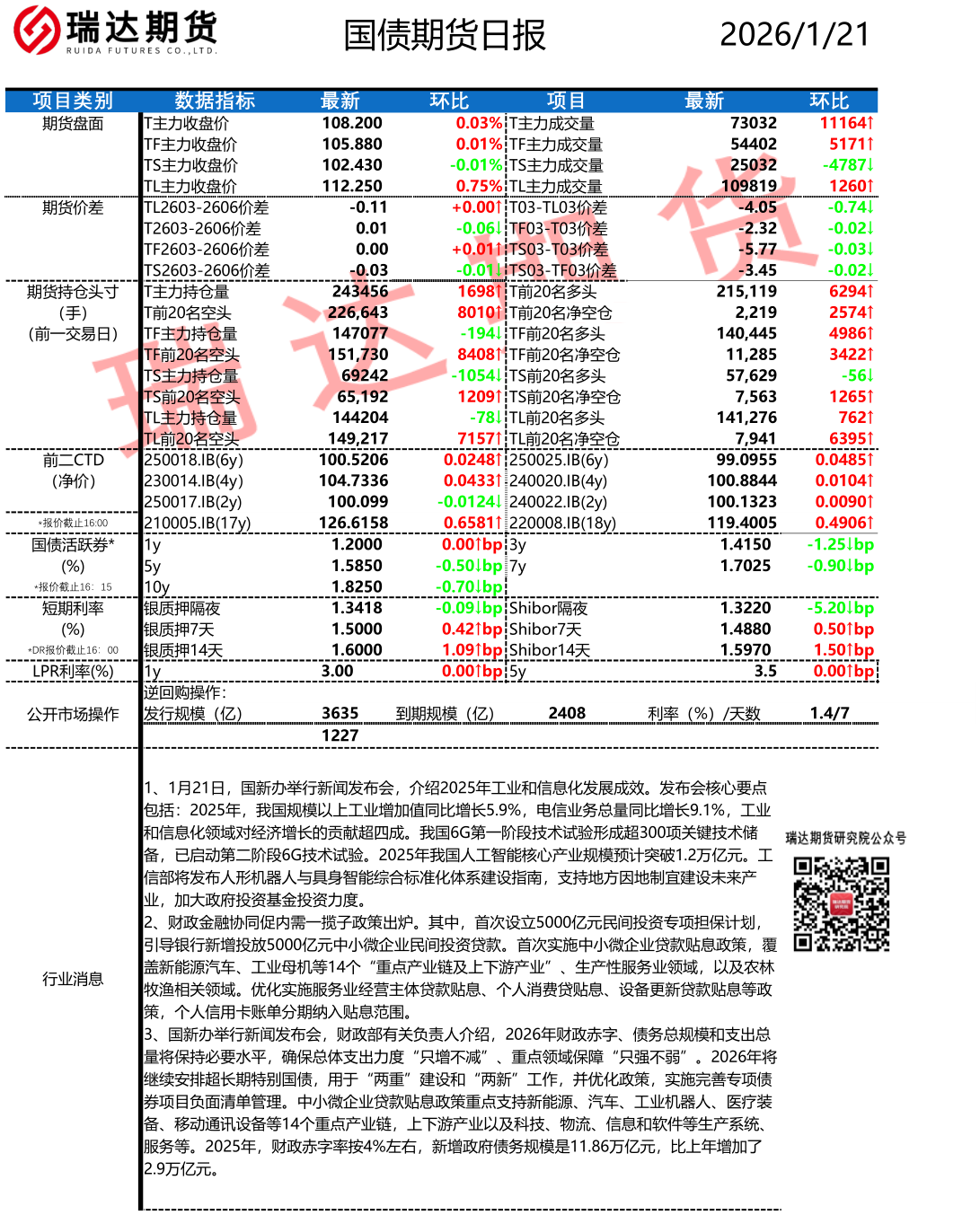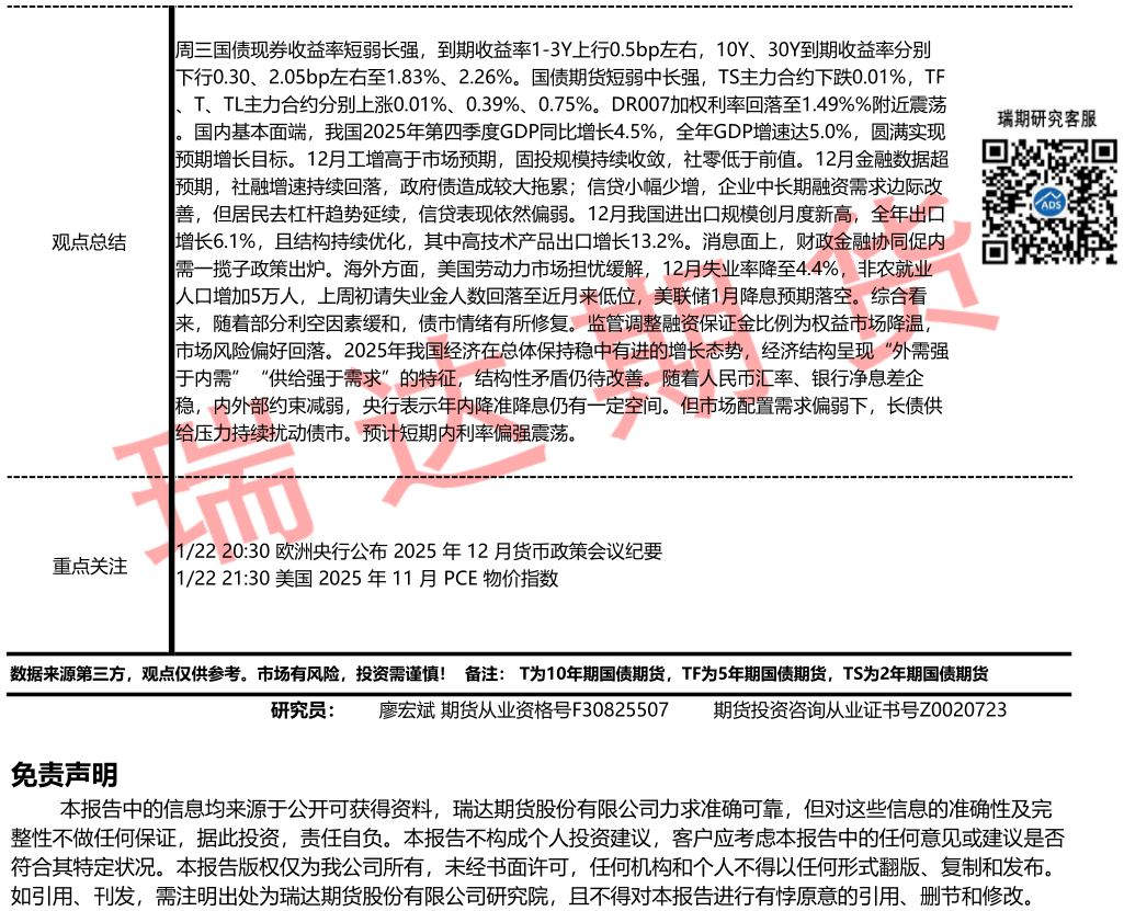 2026-01-22瑞达期货国债期货市场每日全景分析报告20260122