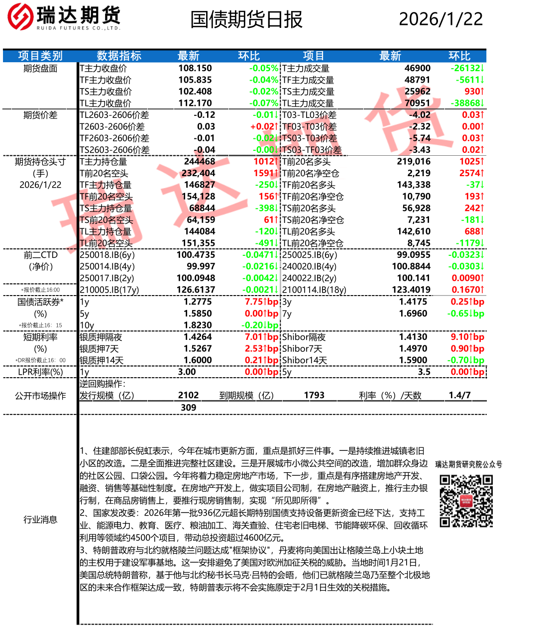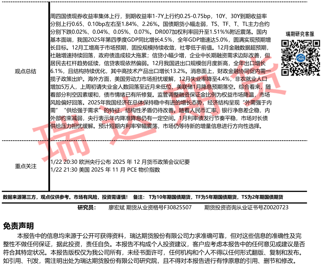 2026-01-22瑞达期货国债期货市场每日全景分析报告20260122