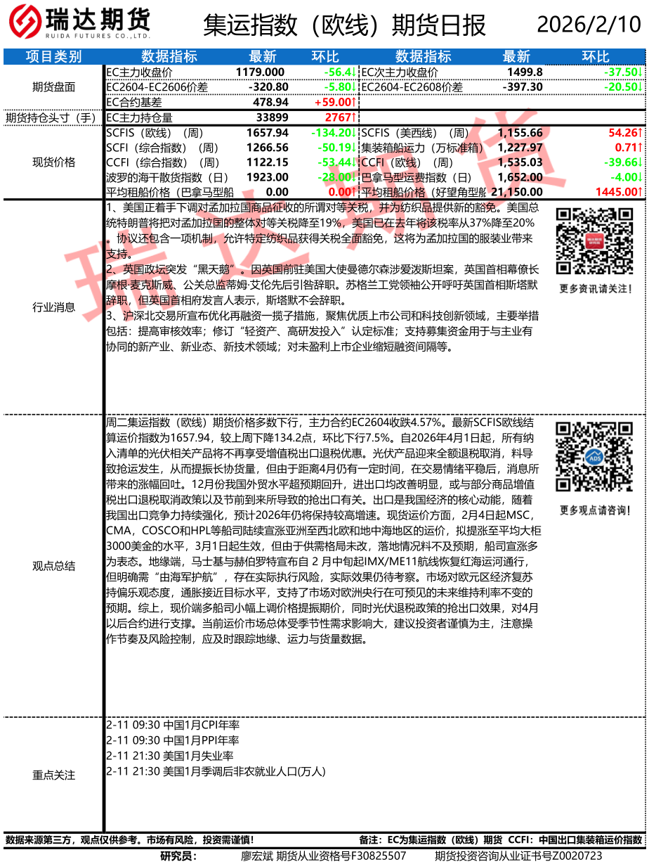 2026-02-10瑞达期货集运指数(欧线)期货市场每日全景分析报告20260210