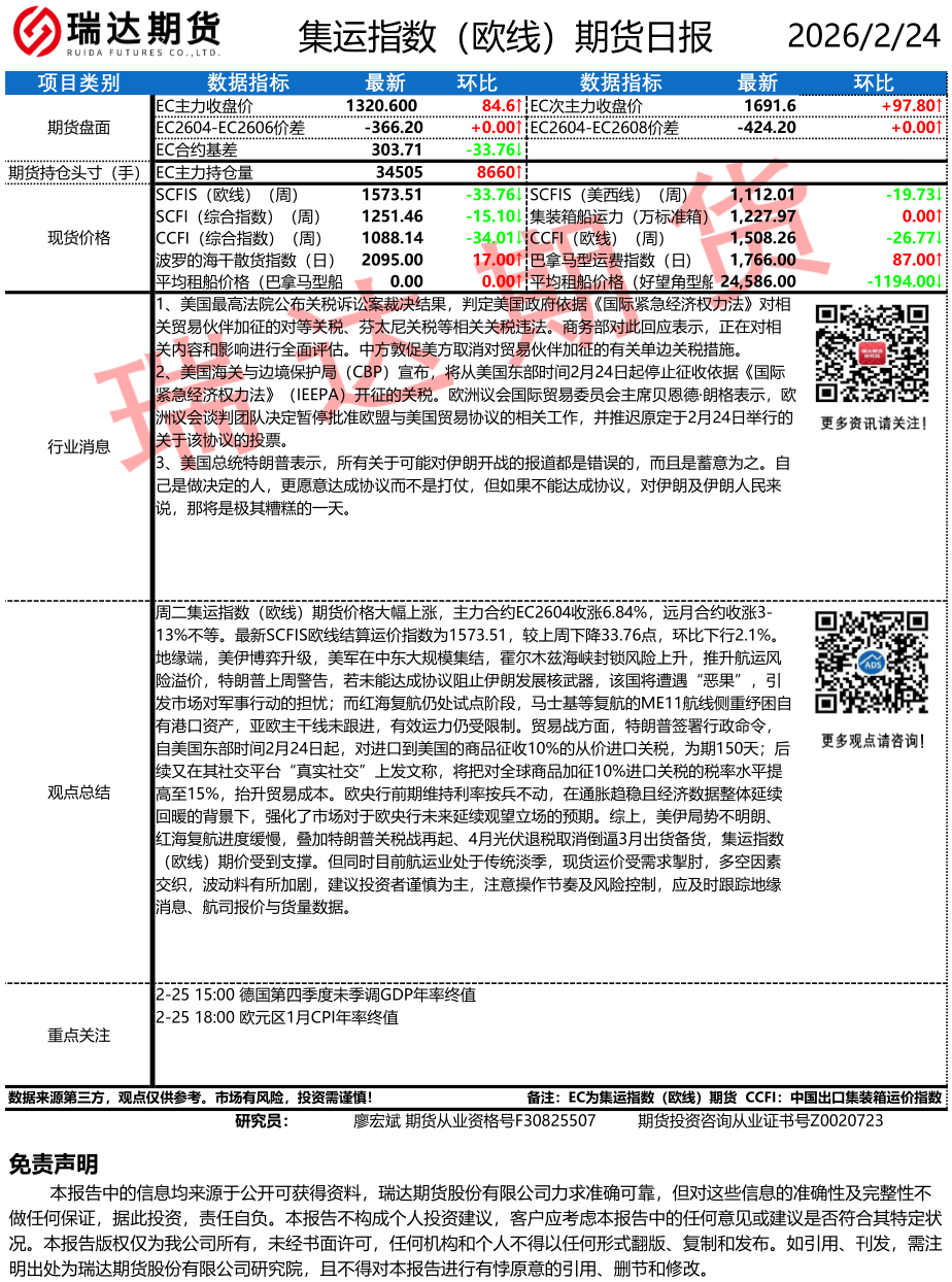 2026-02-24瑞达期货集运指数(欧线)期货市场每日全景分析报告20260224