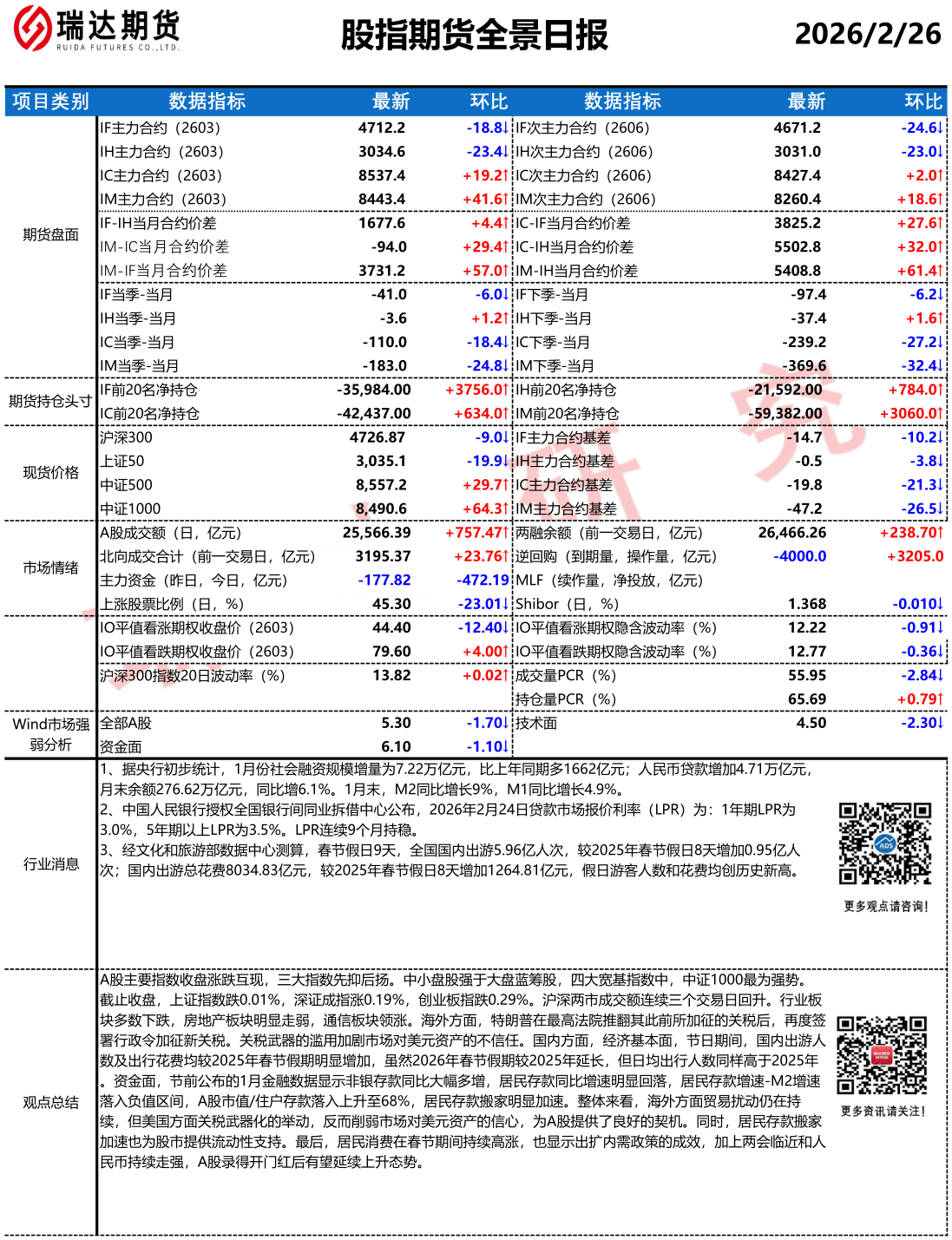 2026-02-26瑞达期货股指期货市场每日全景分析报告20260226