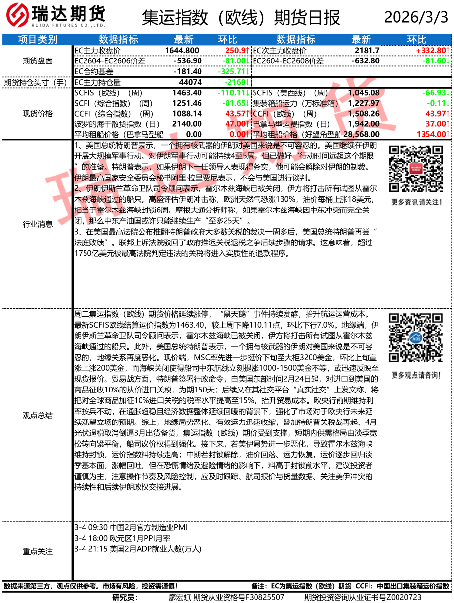 2026-03-03瑞达期货集运指数(欧线)期货市场每日全景分析报告20260303