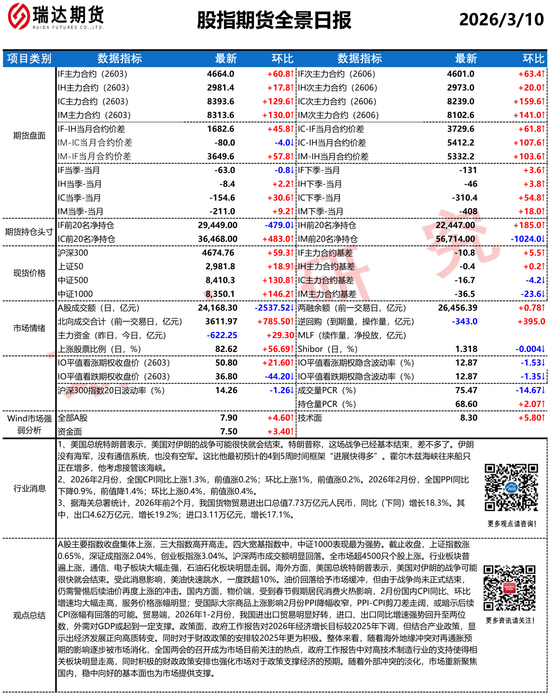 2026-03-12瑞达期货股指期货市场每日全景分析报告20260312