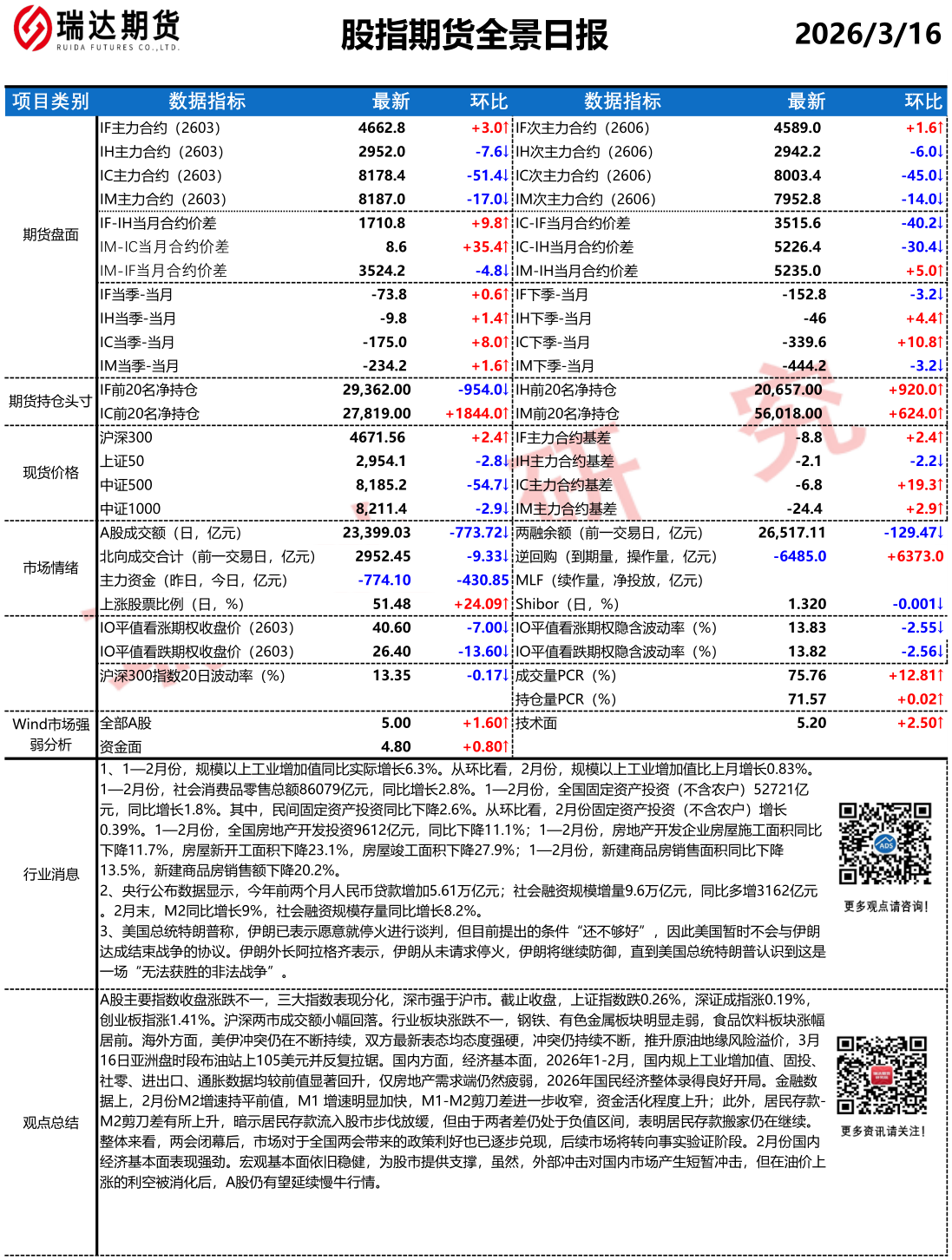 2026-03-16瑞达期货股指期货市场每日全景分析报告20260316