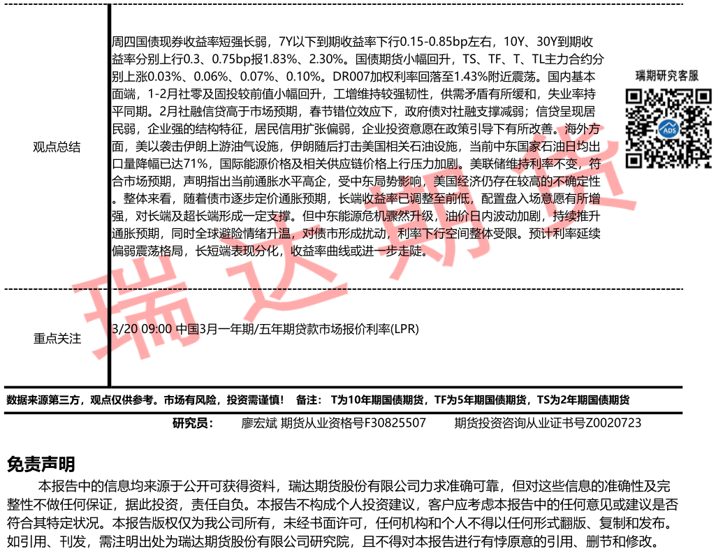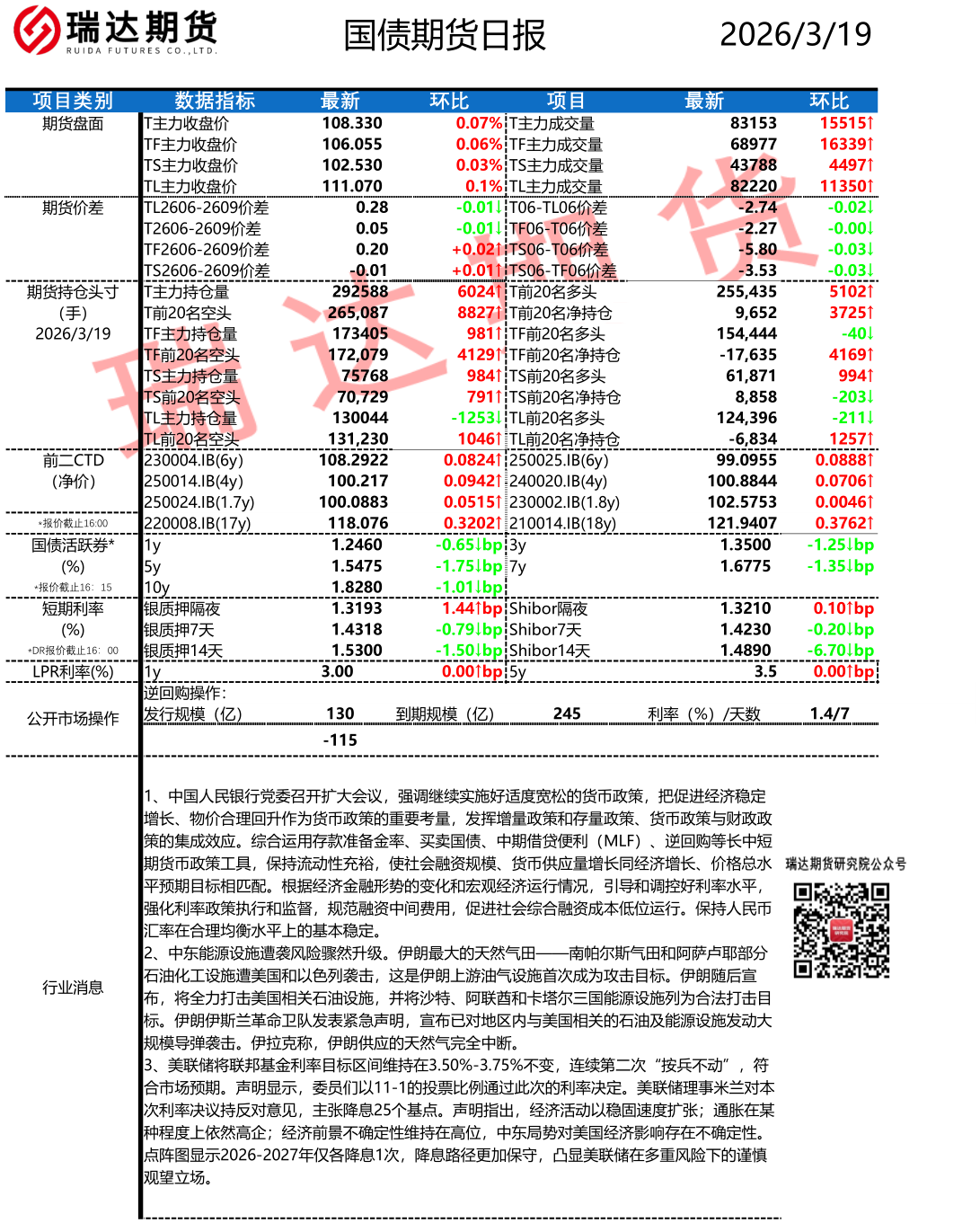 2026-03-19瑞达期货国债期货市场每日全景分析报告20260319