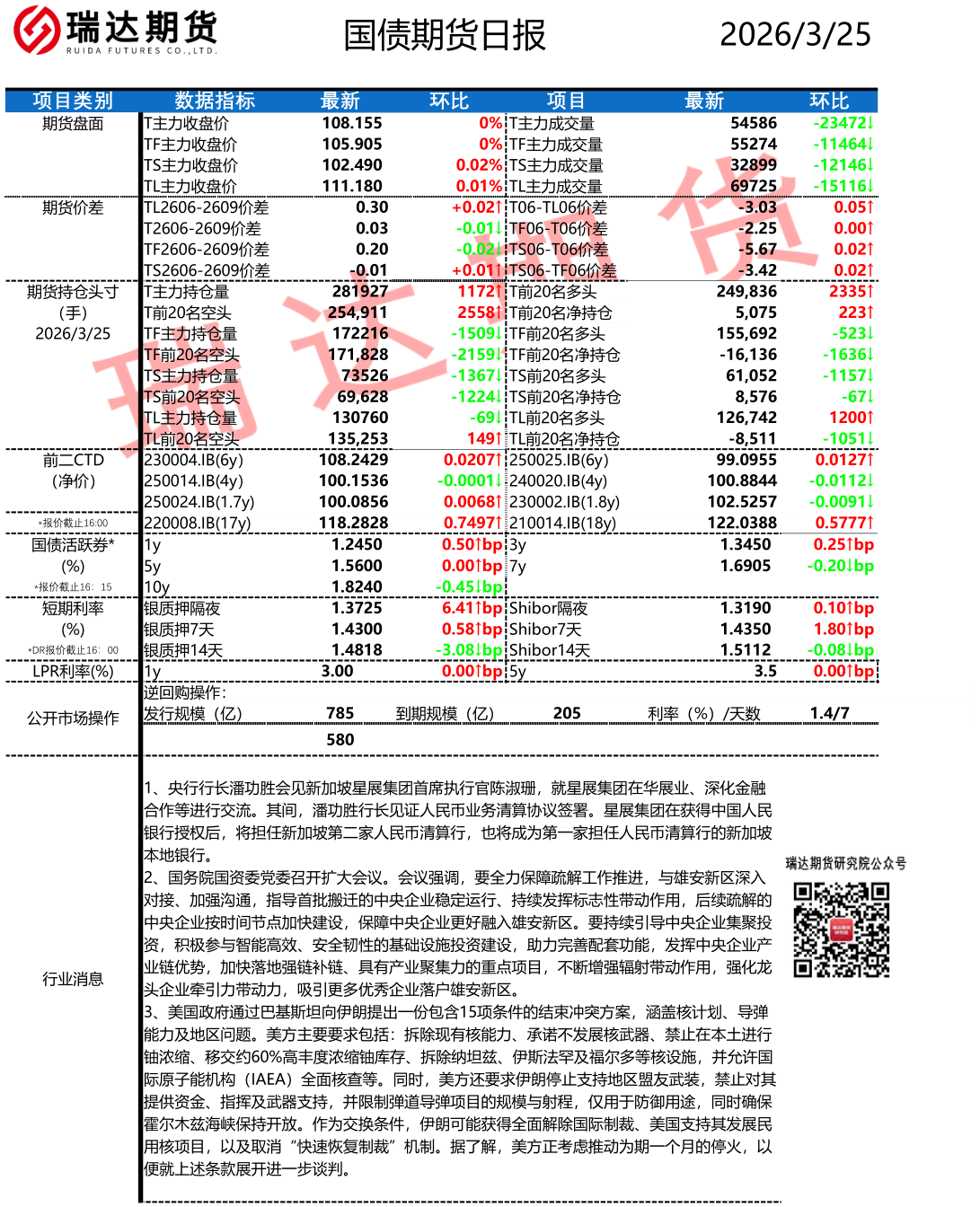 2026-03-25瑞达期货国债期货市场每日全景分析报告20260325