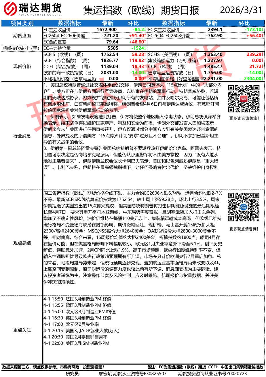 2026-03-31瑞达期货集运指数(欧线)期货市场每日全景分析报告20260331