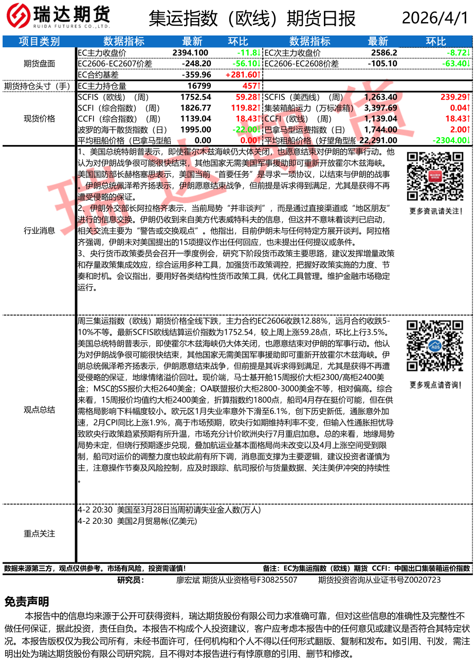 2026-04-02瑞达期货集运指数(欧线)期货市场每日全景分析报告20260402