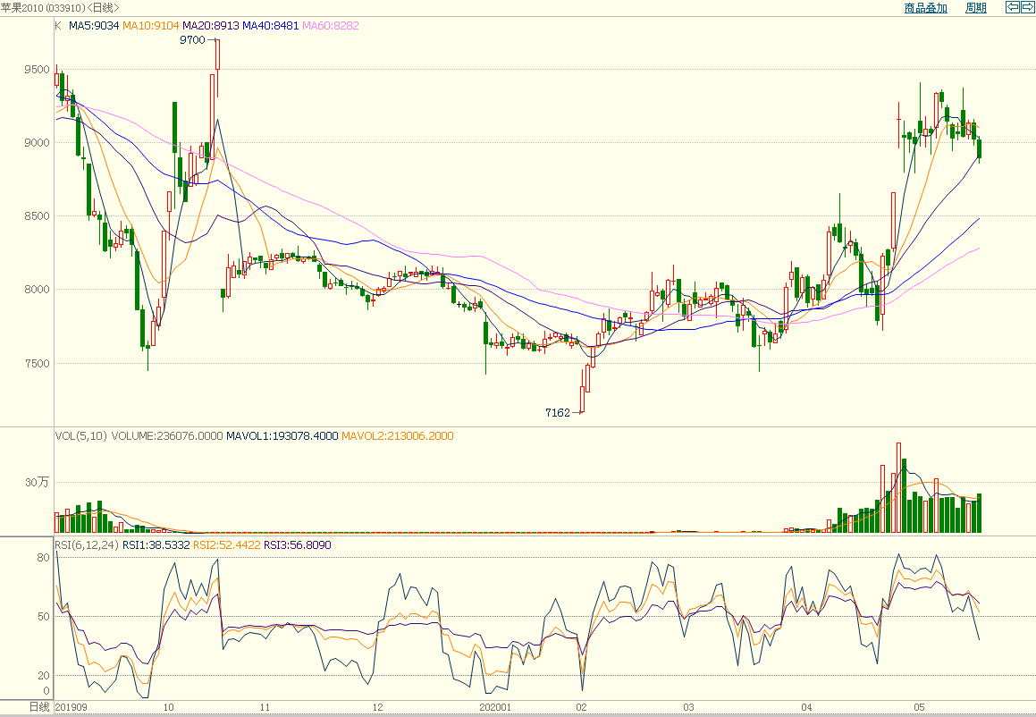 苹果2010合约此前近一个月上里易日维持于9000上方反复振荡运行,量能逐渐萎缩,市场多空趋于变盘,而周四的下破9000动作则对此进行了确认。价格形态上来看,构造了“圆顶”形态,并形成了确认。预计后期仍维持调整,第一目标看前期缺口8664,再者可能是8500关口。