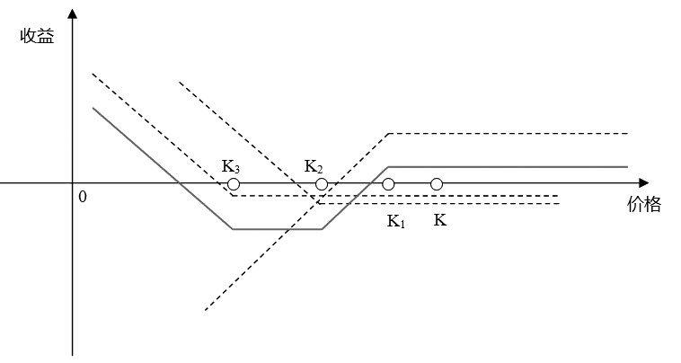 在非熊市市场中,卖出看跌期权不失为一种较好的交易策略,但市场瞬息万变,如果标的物市场价格下行则有可能带来较大风险。为规避这种风险,在卖出一份看跌期权的同时再买入一份同一到期日的看跌期权,则构成了所谓的差价策略。假定当前标的物市场价格为K,在卖出执行价格为K1的看跌期权的同时,买入相同到期日且执行价格为K2的看跌期权,则构成了牛市看跌期权差价策略,其中K2<K1<K。选择两个虚值看跌期权(执行价格小于标的物当前市场价格),是为了确保即使在标的物市场价格不变动的情况下仍能够获得一定收益。因为执行价格为K2的看跌期权比执行价格为K1的看跌期权更加虚值,意味着前者权利金低于后者,因而该差价策略在组合之初就是有收益的。