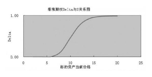 图2为看涨期权买方的delta变动图,作为卖方,前面加负号即可。图中反映出,当实值程度越深时,delta越接近于1。图2中的“S”形态是由gamma决定。