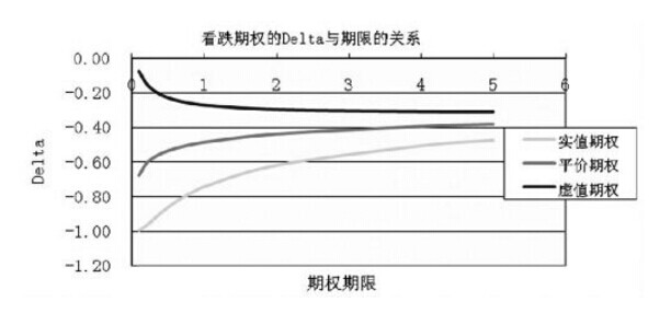 图2和图3还反映了有关delta的另一条规律,就是对于实值、虚值与平值期权,他们有不同的delta水平。一般而言,实值期权delta的绝对值大于0.5,平值期权delta的绝对值接近0.5,虚值期权delta的绝对值小于0.5。