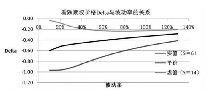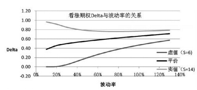 随着波动率的上升,delta的绝对值逐渐向0.5靠拢。即随着波动率的上升,虚值期权的delta上升,实值期权的delta下降。