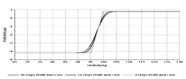 比如,我们构造如下的牛市差价组合,即买入执行价格为95的看涨期权,同时卖出执行价格为100的看涨期权,合约其余因素均相同。