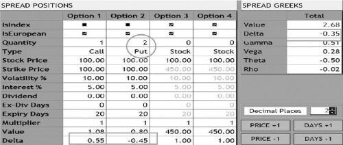有一种称为“条式组合”的策略,与跨式组合类似,但不对称性更明显,尽管大涨与大跌均能赚钱,但大跌时候赚的钱比大涨时多,这种组合是由两份看跌期权与一份看涨期权组合而成,组合的结果是delta为负值。