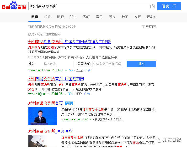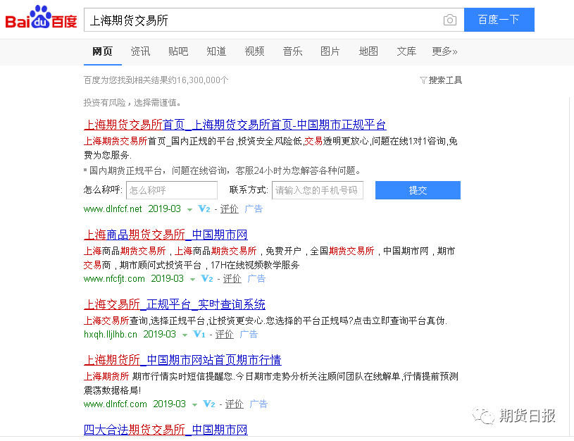 对于“度娘”的显示结果,小明和“吃瓜群众”早已是心知肚明,谁给钱就把谁的名次往前挂、往前排。反正点击一下,财源滚滚来,“度娘”乐意干这事!内地四大期货交易所估计是没有给“度娘”投点费用啥的,结果排名只能排在上述各“期货平台”财神爷的后面!
