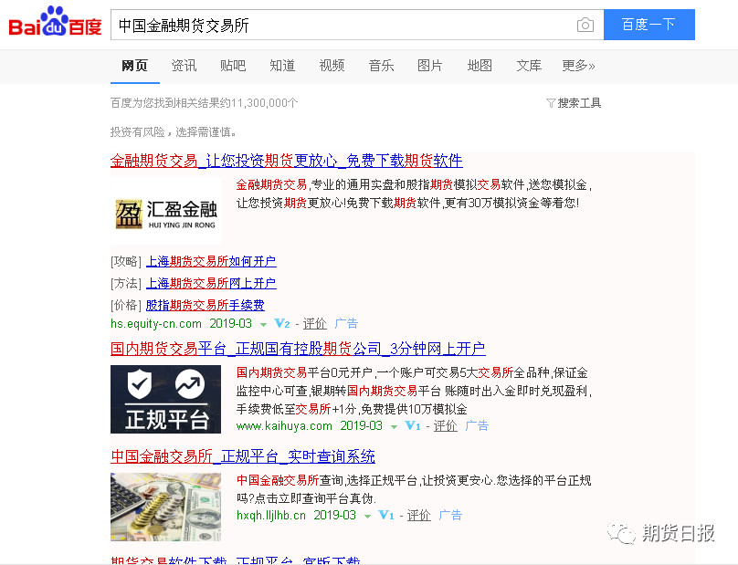 随后,小明又陆续搜索了大连商品交易所、郑州商品交易所和中国金融期货交易所,显示结果满屏都是各种期货交易平台。