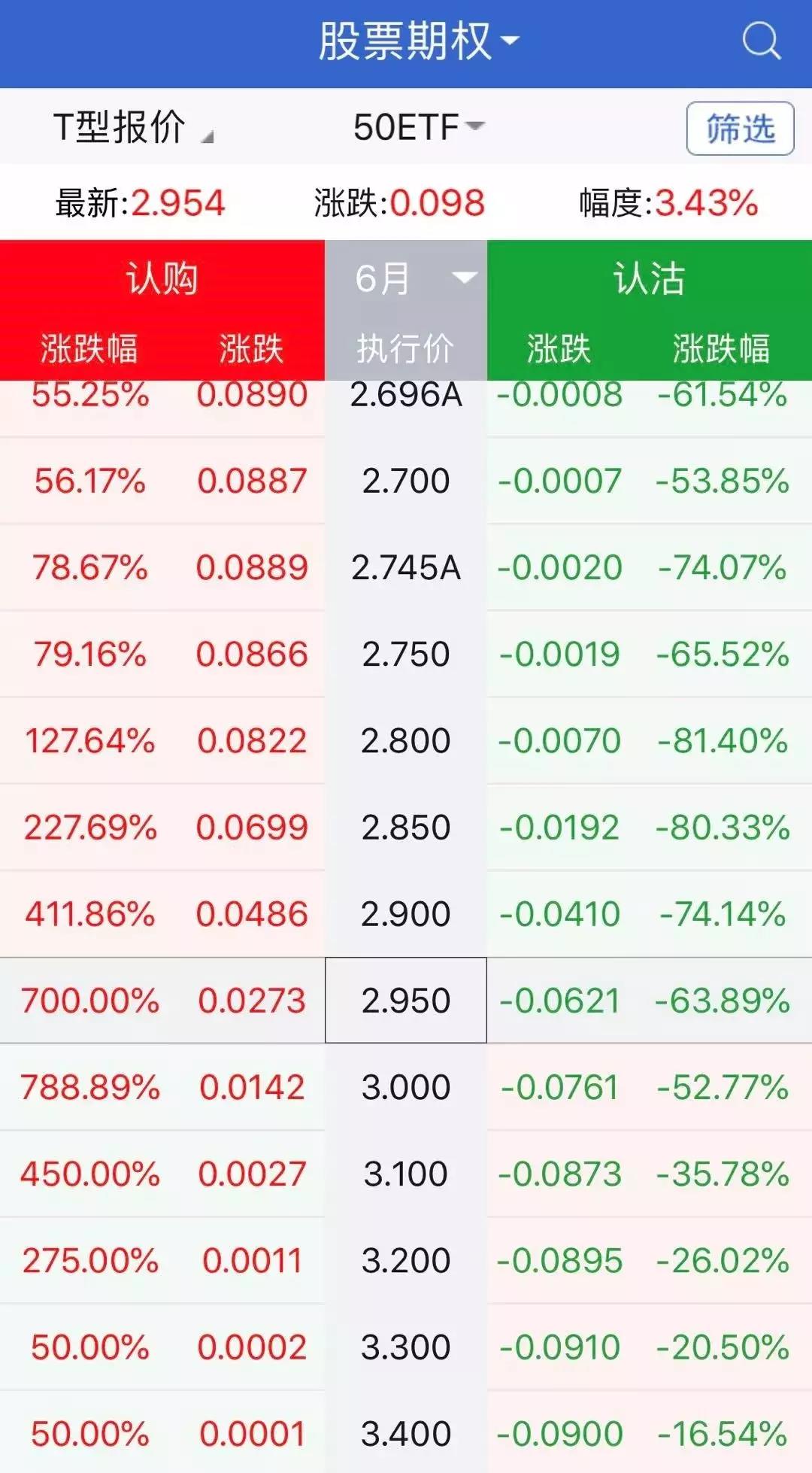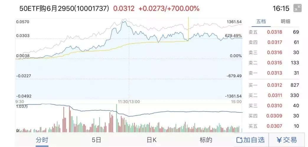 另一只50ETF购6月2950合约早盘盘中最高涨幅则为1361.54%。
