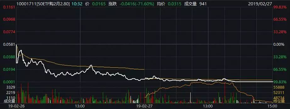 2月26日至2月27日,上涨逾192倍的50ETF购2月2800期权合约直线下跌,27日收报0.0001元,价值归零。