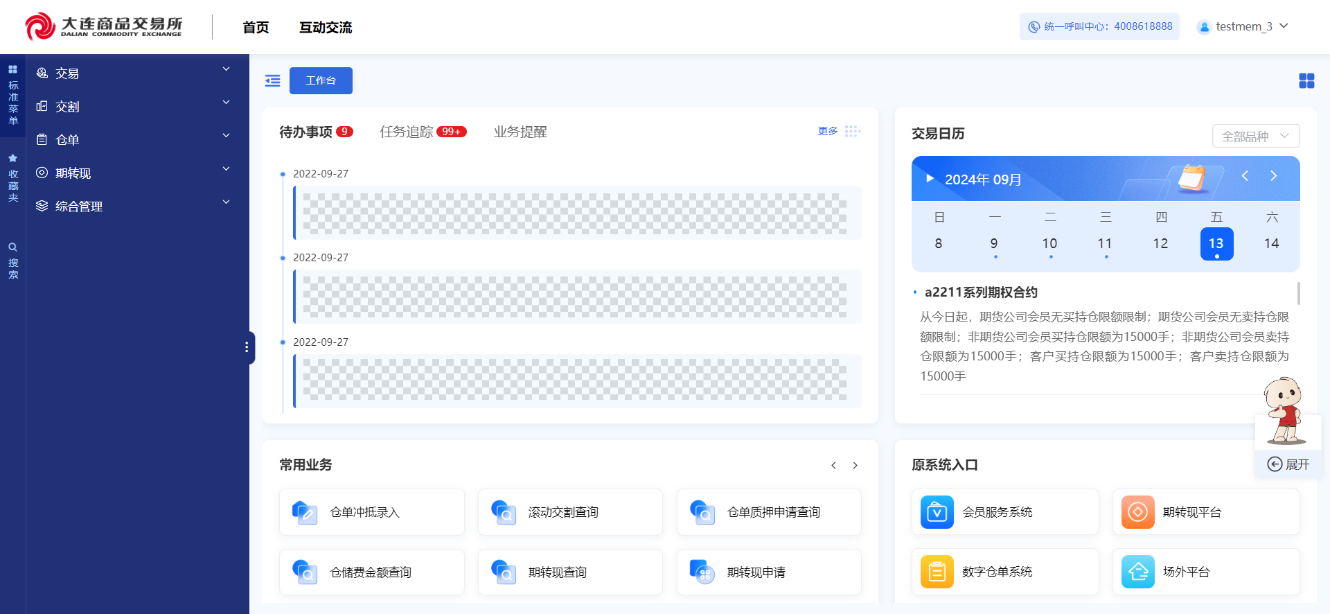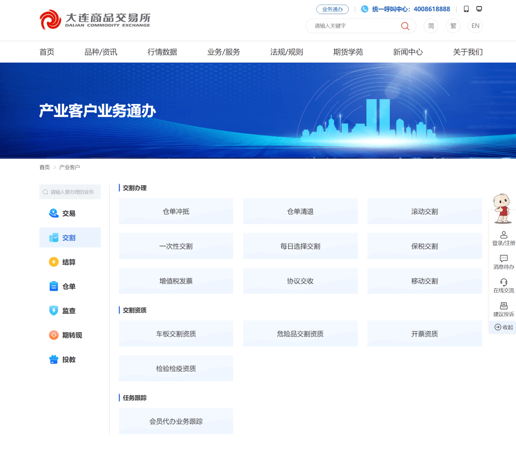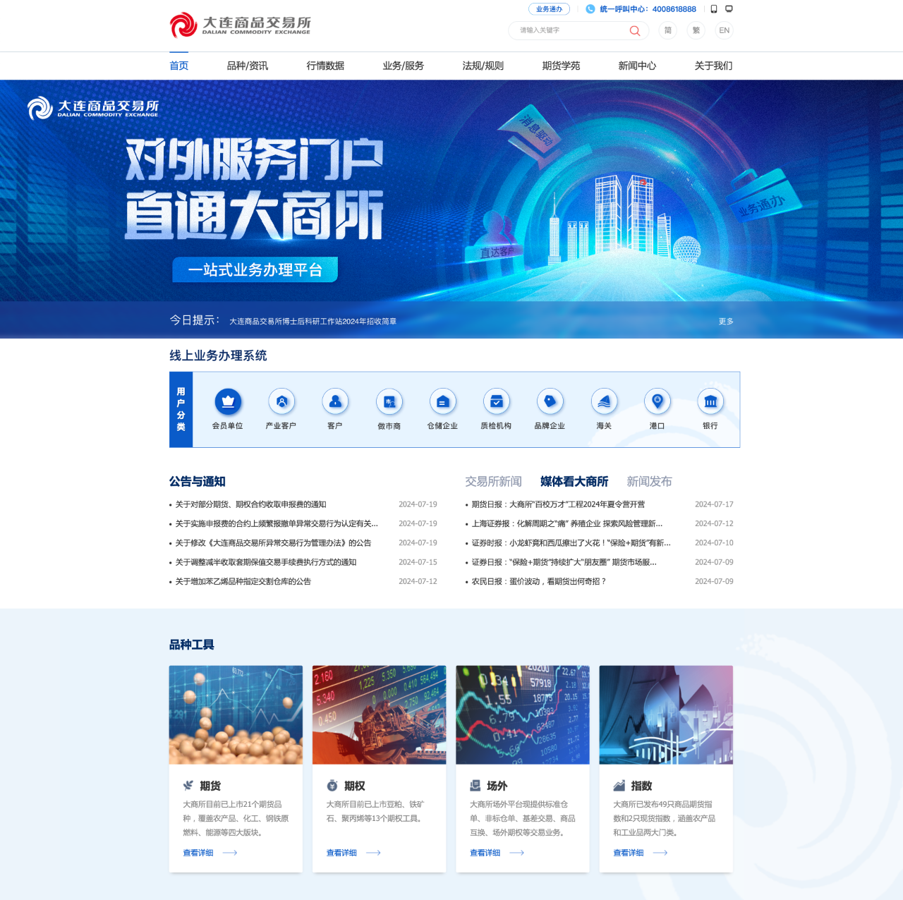 大商所对外门户以提升业务办理效率、提高市场服务水平、满足市场参与者多元化需求为目标,坚持“科技驱动、用户至上”的总体原则,根据期货市场“生态圈”中不同市场参与者需求,提供多项业务办理的集成化服务,并通过支持APP、电脑客户端及网页等多渠道访问,实现信息汇聚、直达客户、消息驱动、便捷办理,为不同类别的用户打造专属、高效的“一站式”业务服务平台。