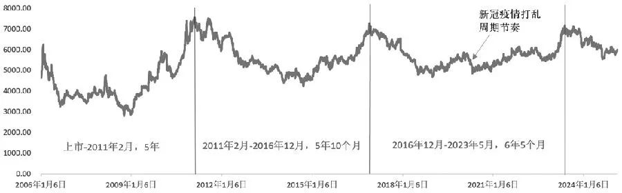 第一个周期为上市—2011年2月,持续时间为5年,但受上市时间窗口影响,此轮白糖周期并未完整体现出来。其中价格底部为2008年10月的2868元/吨,顶部为2011年2月的7548元/吨,价格波动幅度为4680元/吨。
