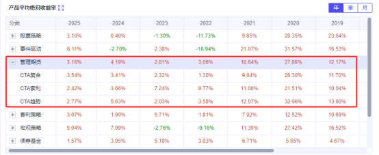 可以看到,2019年到2025年至今,CTA连续7年实现正收益,即使在A股熊市的2022—2023年,CTA的表现也是相对不错。