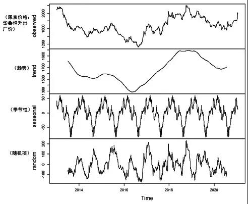 从尿素供需情况看,生产端“冬季弱、其他季节强”,消费端“春季最强、其他季节递减”。直观上来说,由于春播秋收的自然法则,尿素下游的农业需求存在季节性是毋庸置疑的,而对于我们最关心的影响尿素价格波动的因素,季节性需求仅仅是其中的一个扰动因素。宏观上的经济周期、产能周期、货币政策和财政政策,微观上的生产开工、企业利润、出口数量、其他需求等,都会对尿素价格波动产生影响。本文选用山东德州华鲁恒升小颗粒尿素出厂价,使用时间序列的分解模型,将影响尿素价格的因素拆分成趋势性、季节性、随机性三项,尝试探讨季节性规律对尿素价格波动带来的影响。一般来说,市场周期是由长周期和短周期嵌套而成的,长周期可以称为趋势,短周期则可以称为季节性。在数据统计领域,季节性、季节变化量、周期变量或者周期波动都被认为是周期性变量的时间序列表现形式。其中,季节性是时间序列的一个组成成分,被定义为在一年或者更短的时期内在一个趋势线上重复性和可预测的变动。为探讨尿素的季节性规律,本文选用山东德州华鲁恒升小颗粒尿素出厂价,使用时间序列的分解模型,将影响尿素价格的因素拆分成三项:价格(Pt)=趋势性(Tt)+季节性(St)+随机性(Rt)。首先,趋势项Tt采用中心化的移动平均法得到。其中,f表示时间序列的频率,l表示时间序列的长度,当时间t超出定义的区域时Tt表示为无效值:其次,将价格Pt减去趋势项Tt得到不含趋势的价格项??,将各个周期中相同频率的值平均化后,得到未中心化的季节项,再将结果中心化得到中心化的季节项?,最后将s"t重复至长度为l的时间序列,得到季节项St:P't=Pt-Tt