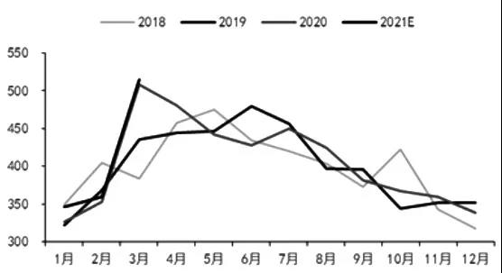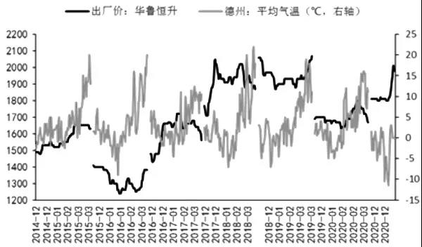 [n=max(n,nf≤1),即l对f取整]最后,将价格Pt减去趋势项Tt和季节项St,得到随机项Rt,即Rt=Pt-Tt-St。首先,我们观察季节性,对有规律可循的季节性而言,每年季节性对尿素价格贡献的高点出现在春季施肥旺季,最高可达50—60元/吨,而进入用肥淡季后,季节性对价格的贡献则在-100元/吨左右。因此,相对确定的季节性价格波动极值在150—160元/吨,即基于季节性的现货价格波动极值约为10%。其次,观察趋势性,趋势性对尿素价格占绝对的主导地位,这符合宏观和周期指引商品大方向的说法,也说明商品需要自上而下进行研究,宏观和周期在更长的时间维度上和更宽的空间维度上影响商品价格,而微观层面的估值和驱动等则是更深层次研究的要求。最后,观察随机性,影响价格的因素多种多样,没有明显规律,但对于短期的价格波动,比预测更重要。笔者将每年12月到次年3月的尿素价格和气温走势共同绘制在下图中,可以看出,每年山东德州的气温出现极低点后,地处德州的华鲁恒升尿素出厂价会出现一波上涨行情。究其原因,笔者认为,极低的温度使得人们取暖的需求大幅增加,环境负荷加重,从而出现由政府主导的限产或停产,在供应减少的背景下,尿素价格会不断上涨。此外,极低的温度导致尿素运输出现问题的可能性加大。关于运输问题对商品价格的影响,还要具体观察上下游的议价能力,以及卖出或买入货物的紧急程度,即有利于议价能力强的一方,总体来说尿素行业的生产企业议价能力较强。从上图也可以观察到,2020年年底德州的温度为近年来的新低,这也从另一方面解释了近期尿素价格大涨的原因。供应方面,尿素的产量基本遵循“冬季弱,其他季节强”的季节性。如前文所述,冬季受气温、环保政策、气头企业停车检修、春节假期等影响,尿素日产量会出现明显的季节性下降。随着气温转暖,环保压力随之下降,天然气供应也开始出现季节性宽松,在下游需求的拉动下,尿素产量会出现季节性的攀升过程。需求方面,主要分为农业需求和工业需求,其中农业需求部分约占总需求的70%。农业用肥有明显的季节性,例如,2—3月小麦、水稻施肥,4—5月玉米、水稻施肥,9—10月小麦、水稻、油菜施肥,冬季冬储备肥等。农业的刚性需求是季节性行情相对坚挺的底层逻辑,而相对确定的需求会为尿素价格带来一定的安全边际,是影响尿素季节性最重要的因素。出口方面,出口是影响尿素季节性的“X因素”,具有“农需淡季、出口旺季”的季节性特点,但出口量的大小因为国内外价差和印度按需采购招标,具有一定的不确定性。正是由于这些不确定性,出口成为尿素需求的重要边际变量,在2020年引起过一波上涨行情。回顾这段行情,2020上半年本应处于全球工业品的补库阶段,但受疫情影响,补库过程推迟到了下半年,补库需求导致出口量激增,国内尿素价格也随之上涨。库存方面,库存作为供需的结果必然也具有季节性,农需旺盛的时段大概率去库,农需清淡的时段大概率累库。值得注意的是,当前尿素的企业库存已经降至近年来的低位水平,低库存是近期尿素上涨行情的重要前提,而在持续下降的库存预期下,2021年春季的季节性需求可能会对产业上下游造成更多矛盾。本文将影响尿素价格波动的因素拆分为趋势性、季节性和随机性三项,尝试探讨确定的季节性能为尿素价格波动提供更多的安全边际。具体表现是:平均气温出现最低点后,尿素价格会出现季节性上涨行情;生产端有“冬季弱、其他季节强”的季节性;消费端有“春季最强、其他季节递减”的季节性;出口端有“农需淡季、出口旺季”的季节性;库存端有“春季去库、秋季累库”的季节性。